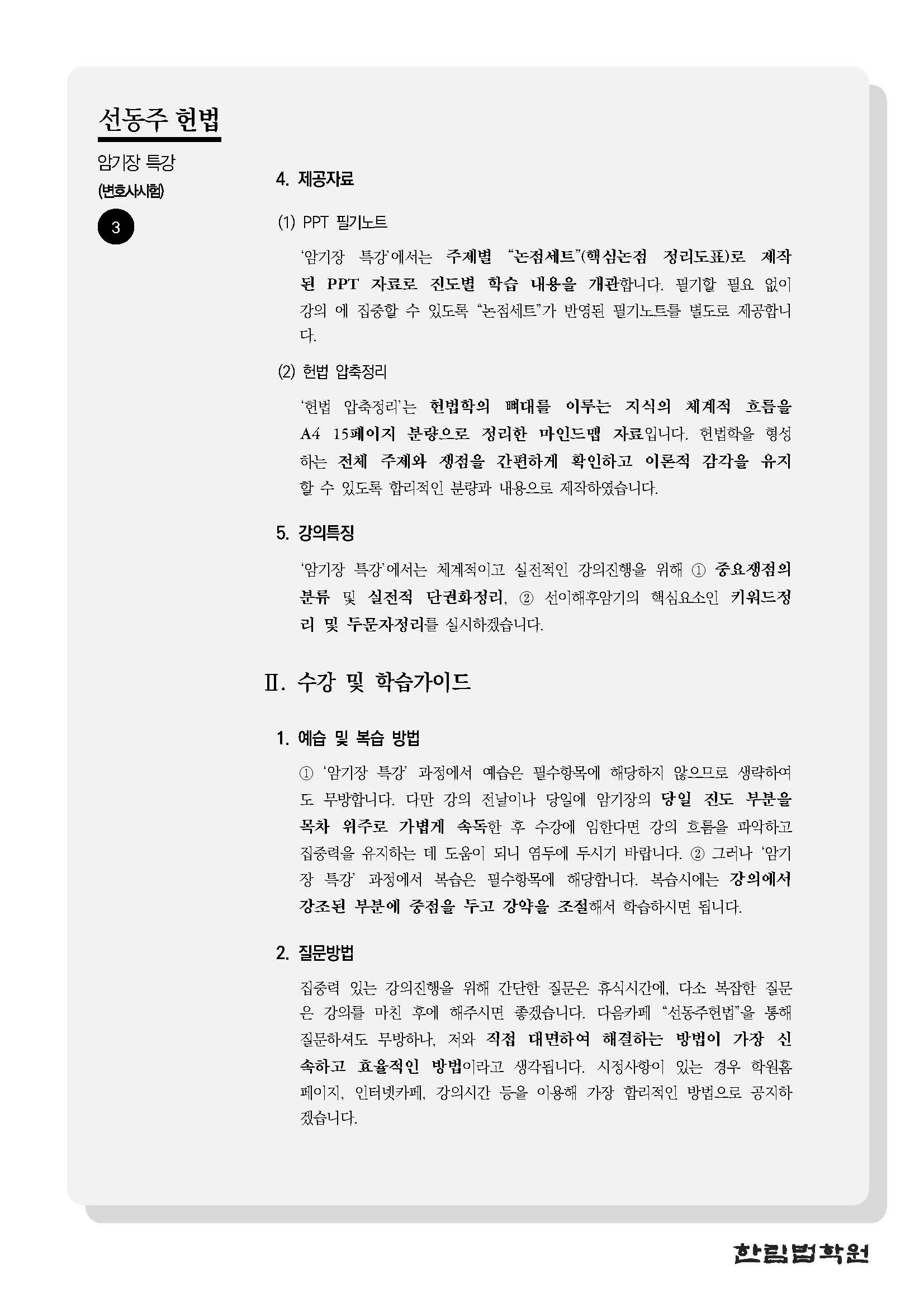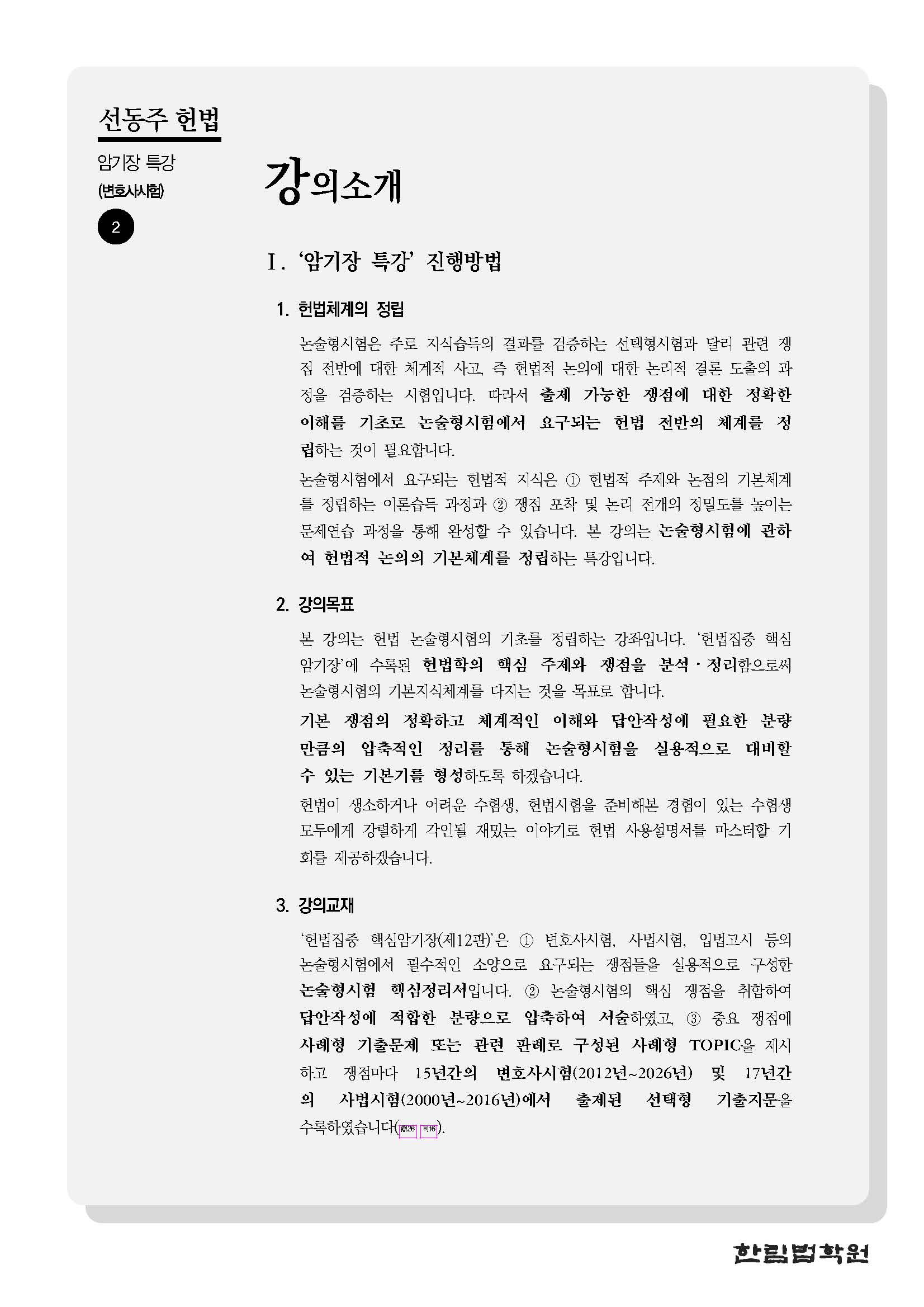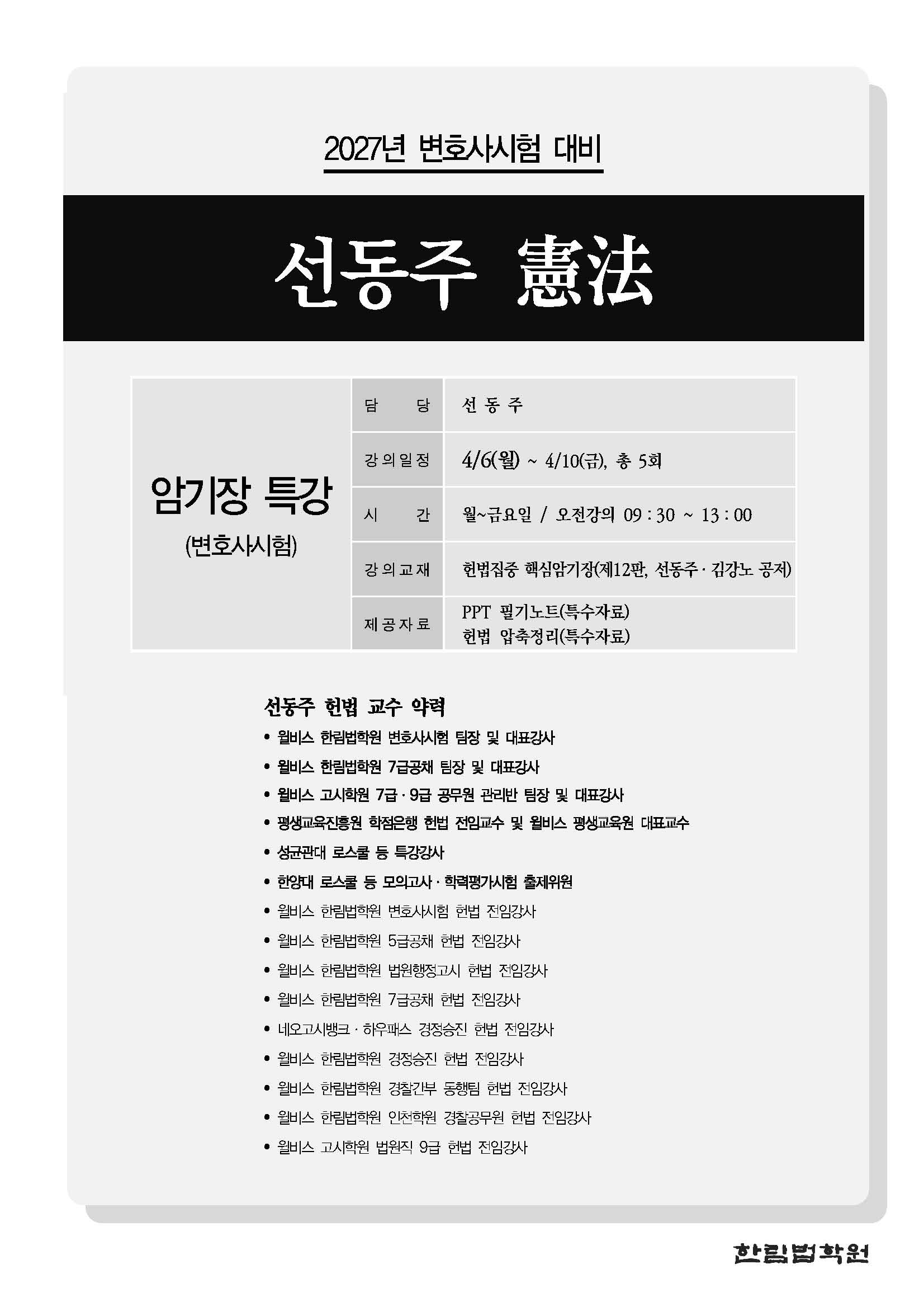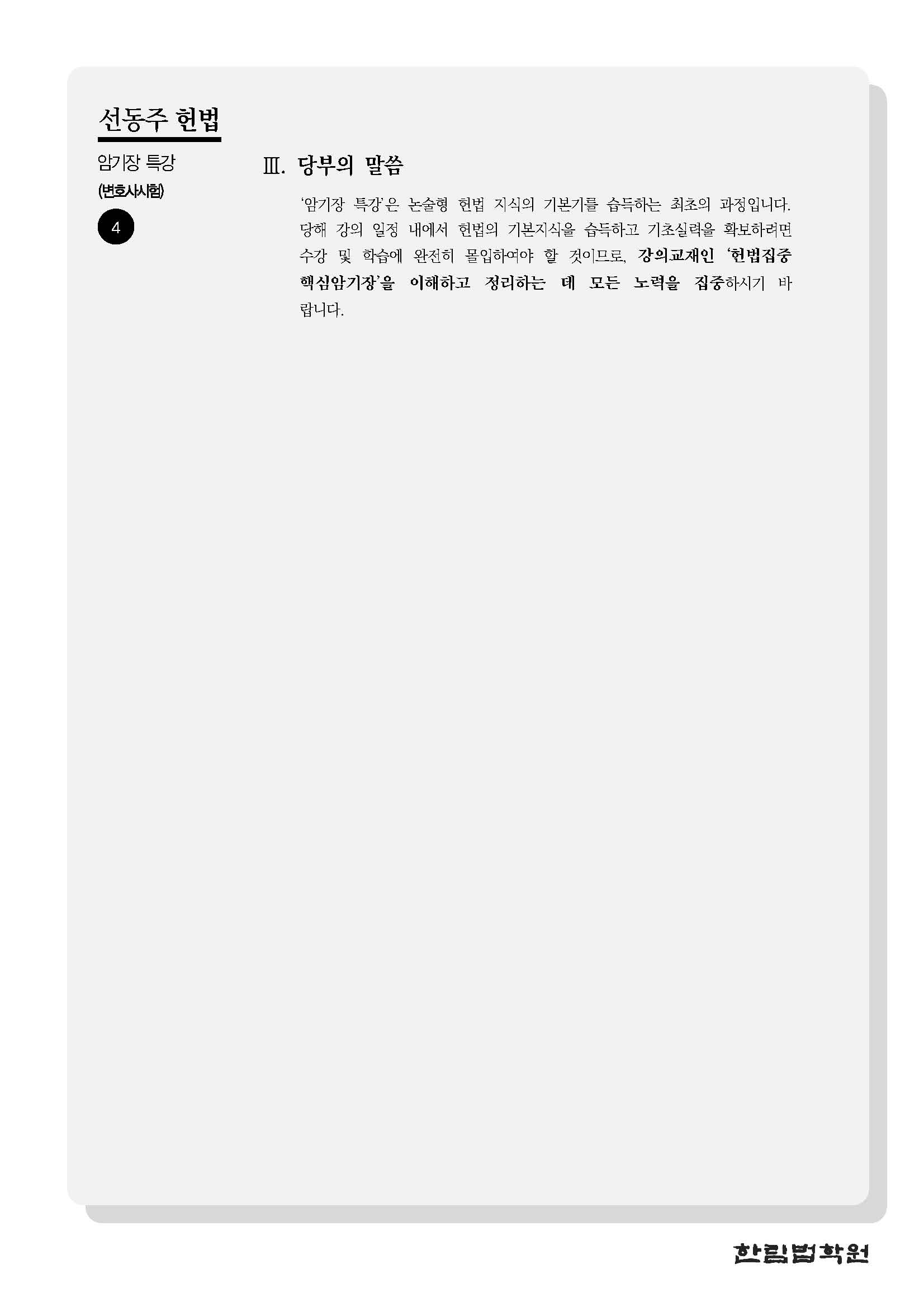 [특강] 선동주 교수 헌법 암기장 특강(4/6, 월) 작성자한림법학원|작성시간26.04.01|조회수16 목록 댓글 0 글자크기 작게가 글자크기 크게가 (0406) 선동주 교수 헌법 암기장 특강 강의계획서.pdf195.21KB 첨부파일첨부된 파일이 5개 있습니다. jpg 파일 (0406) 선동주 교수 헌법 암기장 특강 강의계획서_페이지_1.jpg 다운로드 jpg 파일 (0406) 선동주 교수 헌법 암기장 특강 강의계획서_페이지_3.jpg 다운로드 jpg 파일 (0406) 선동주 교수 헌법 암기장 특강 강의계획서_페이지_2.jpg 다운로드 jpg 파일 (0406) 선동주 교수 헌법 암기장 특강 강의계획서_페이지_4.jpg 다운로드 pdf 파일 (0406) 선동주 교수 헌법 암기장 특강 강의계획서.pdf 다운로드 다음검색 현재 게시글 추가 기능 열기 북마크 공유하기 신고 센터로 신고 댓글 댓글 0 댓글쓰기 답글쓰기 댓글 리스트