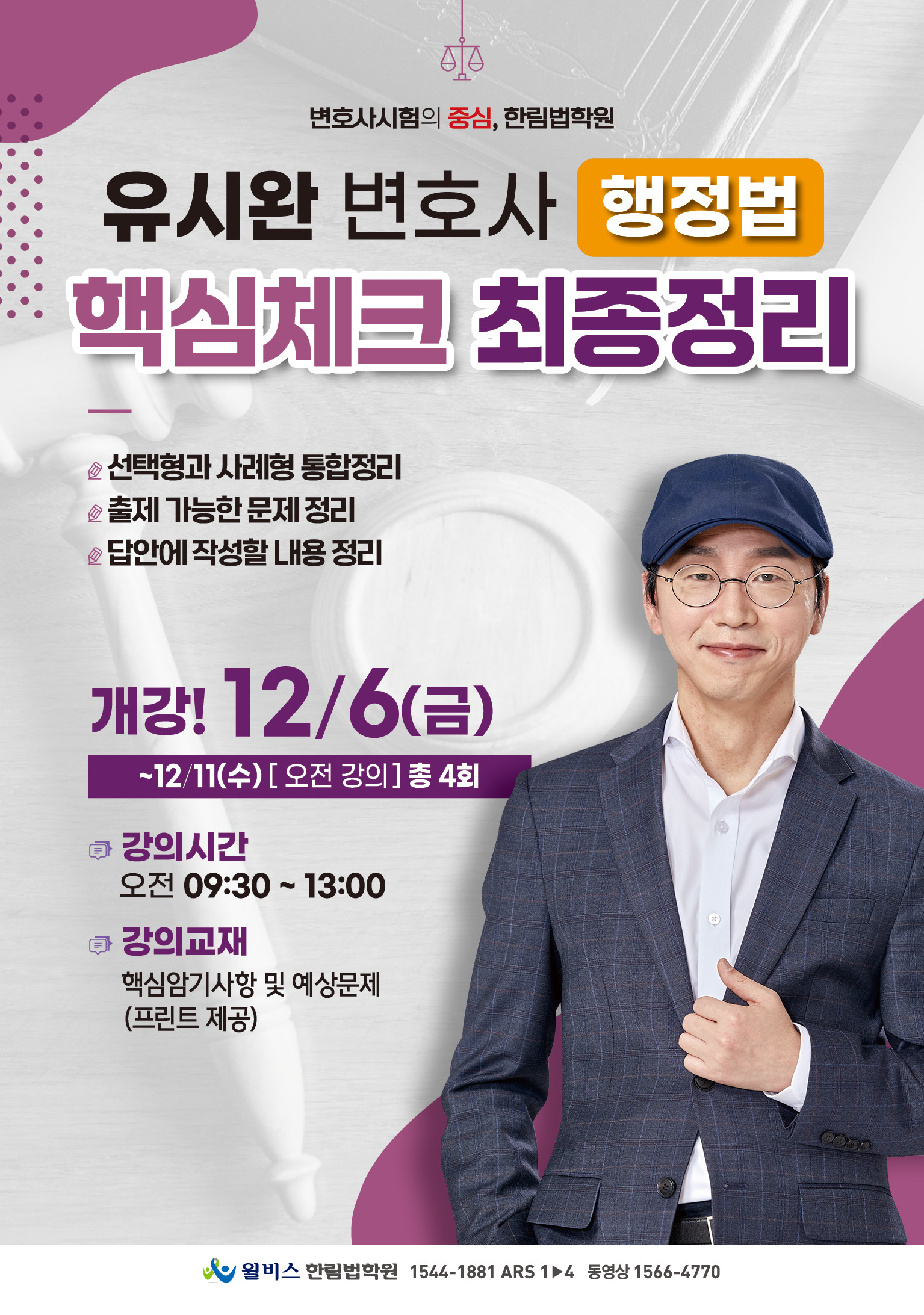 [강의반 4순환] 유시완 변호사 행정법 핵심체크 최종정리 (12/6, 금) 작성자한림법학원|작성시간24.11.27|조회수62 목록 댓글 0 글자크기 작게가 글자크기 크게가 다음검색 현재 게시글 추가 기능 열기 북마크 공유하기 신고 센터로 신고 댓글 댓글 0 댓글쓰기 답글쓰기 댓글 리스트