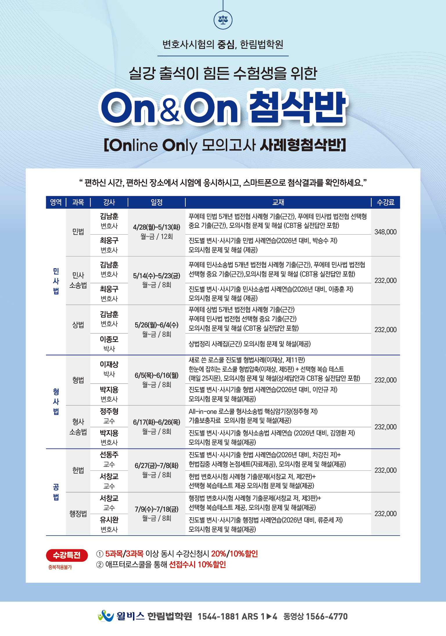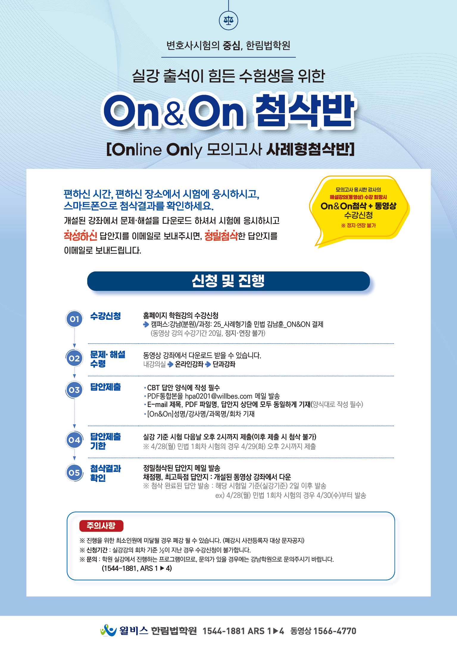 [on&on] 변호사시험 온라인첨삭반 사례형진도별 모의고사 시간표 작성자한림법학원|작성시간25.04.17|조회수189 목록 댓글 0 글자크기 작게가 글자크기 크게가 다음검색 현재 게시글 추가 기능 열기 북마크 공유하기 신고 센터로 신고 댓글 댓글 0 댓글쓰기 답글쓰기 댓글 리스트