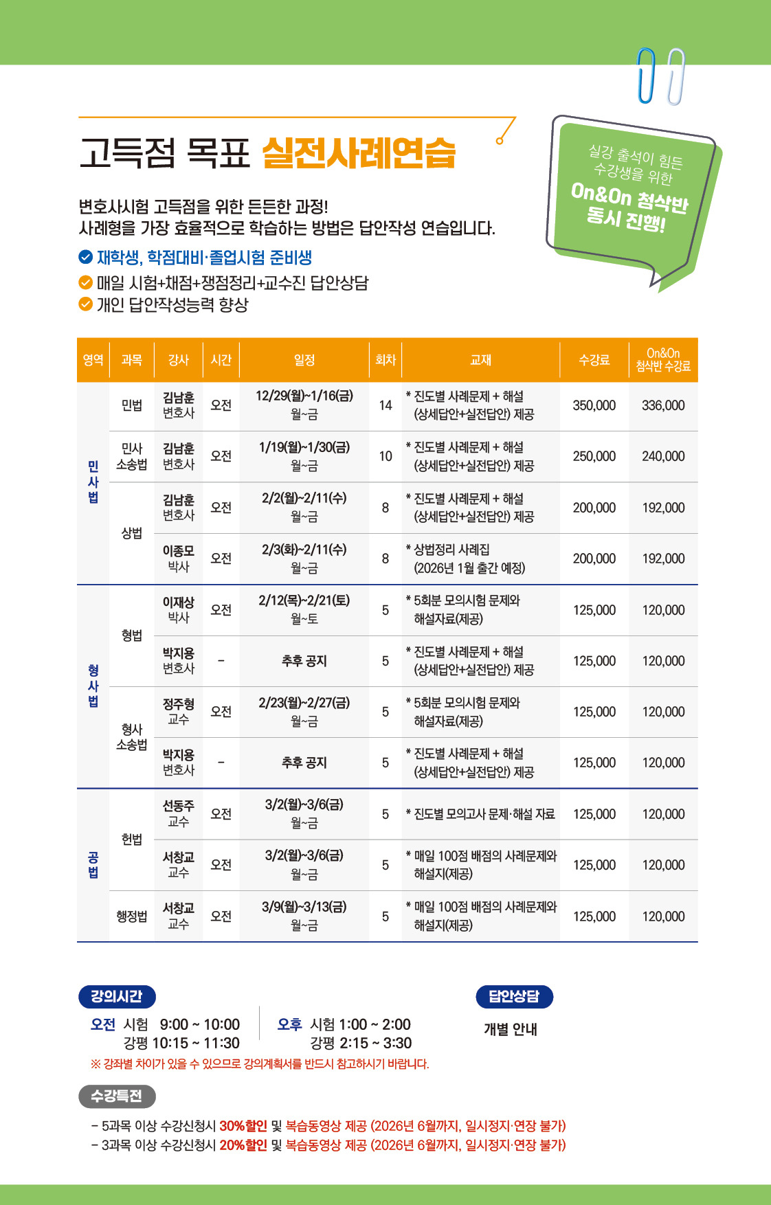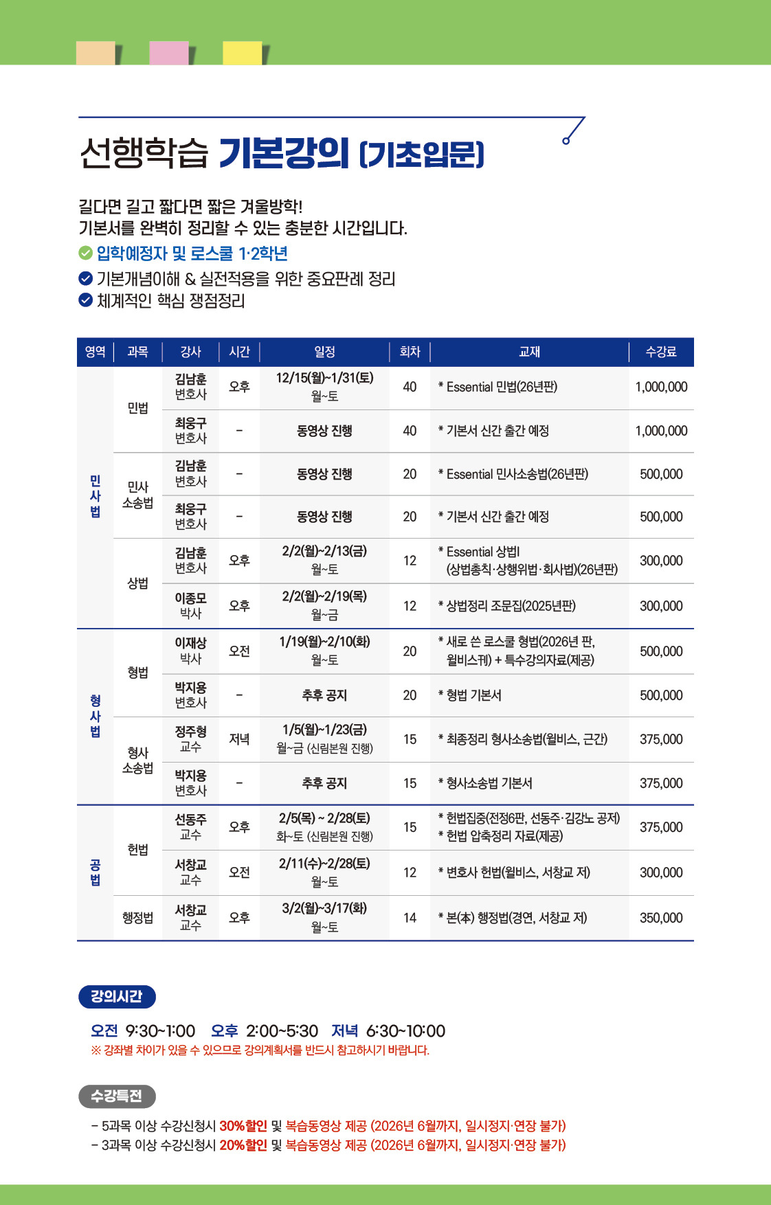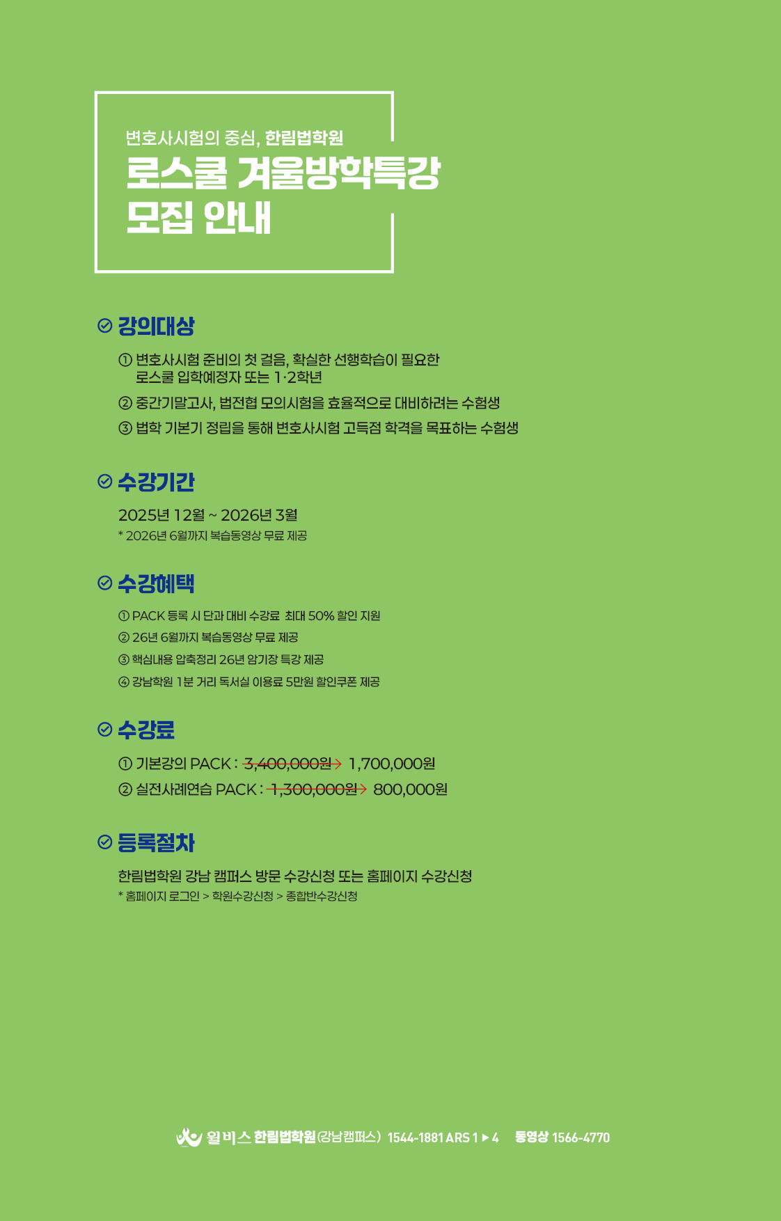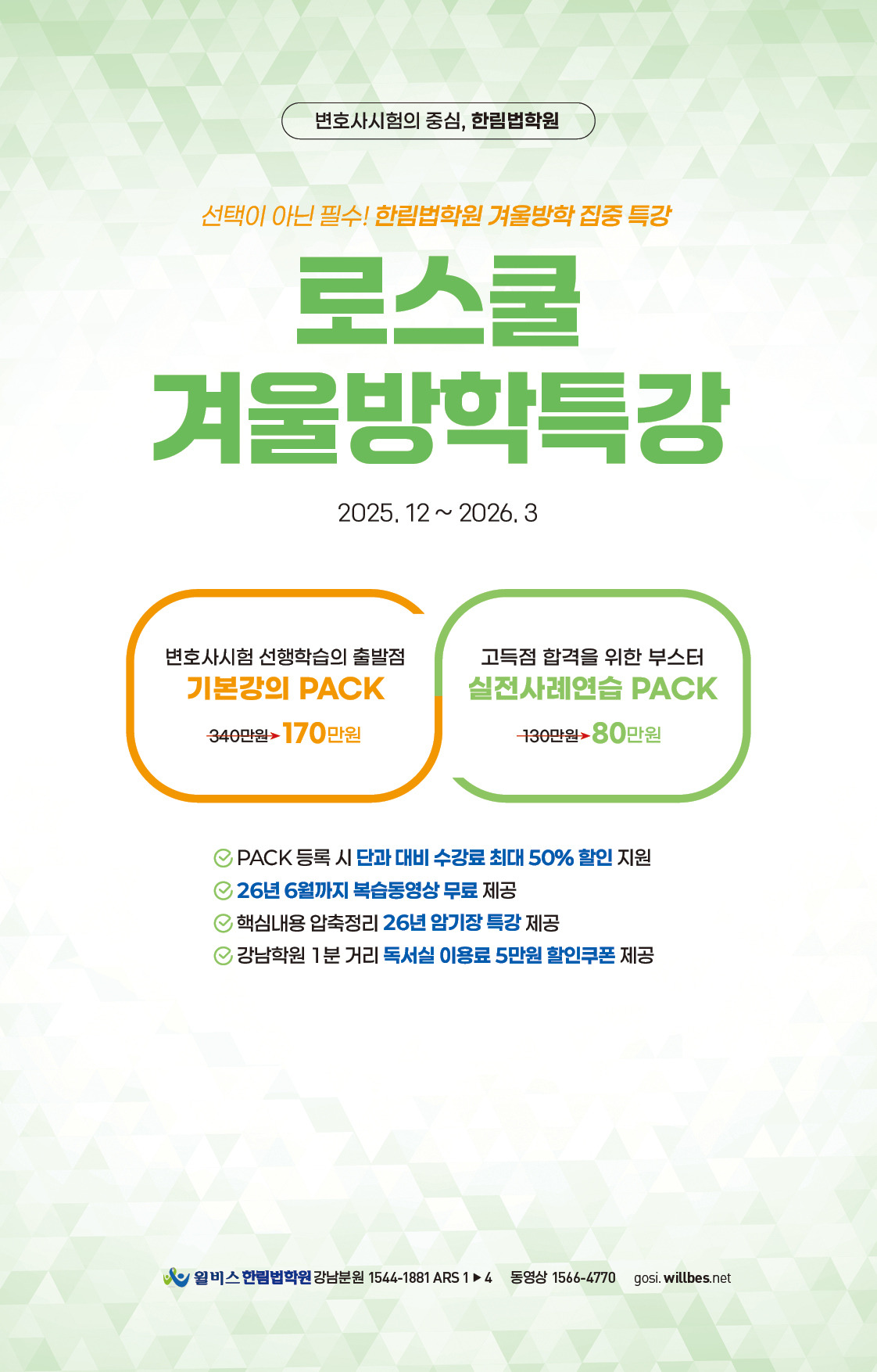 [선행학습] 로스쿨 겨울방학 기본강의&실전사례연습 시간표 작성자한림법학원|작성시간25.11.18|조회수178 목록 댓글 0 글자크기 작게가 글자크기 크게가 2026 변호사 로스쿨 겨울방학특강 팜플렛.pdf2.23MB 첨부파일첨부된 파일이 5개 있습니다. jpg 파일 2026 변호사 로스쿨 겨울방학특강 팜플렛_페이지_1.jpg 다운로드 jpg 파일 2026 변호사 로스쿨 겨울방학특강 팜플렛_페이지_3.jpg 다운로드 jpg 파일 2026 변호사 로스쿨 겨울방학특강 팜플렛_페이지_4.jpg 다운로드 jpg 파일 2026 변호사 로스쿨 겨울방학특강 팜플렛_페이지_2.jpg 다운로드 pdf 파일 2026 변호사 로스쿨 겨울방학특강 팜플렛.pdf 다운로드 다음검색 현재 게시글 추가 기능 열기 북마크 공유하기 신고 센터로 신고 댓글 댓글 0 댓글쓰기 답글쓰기 댓글 리스트