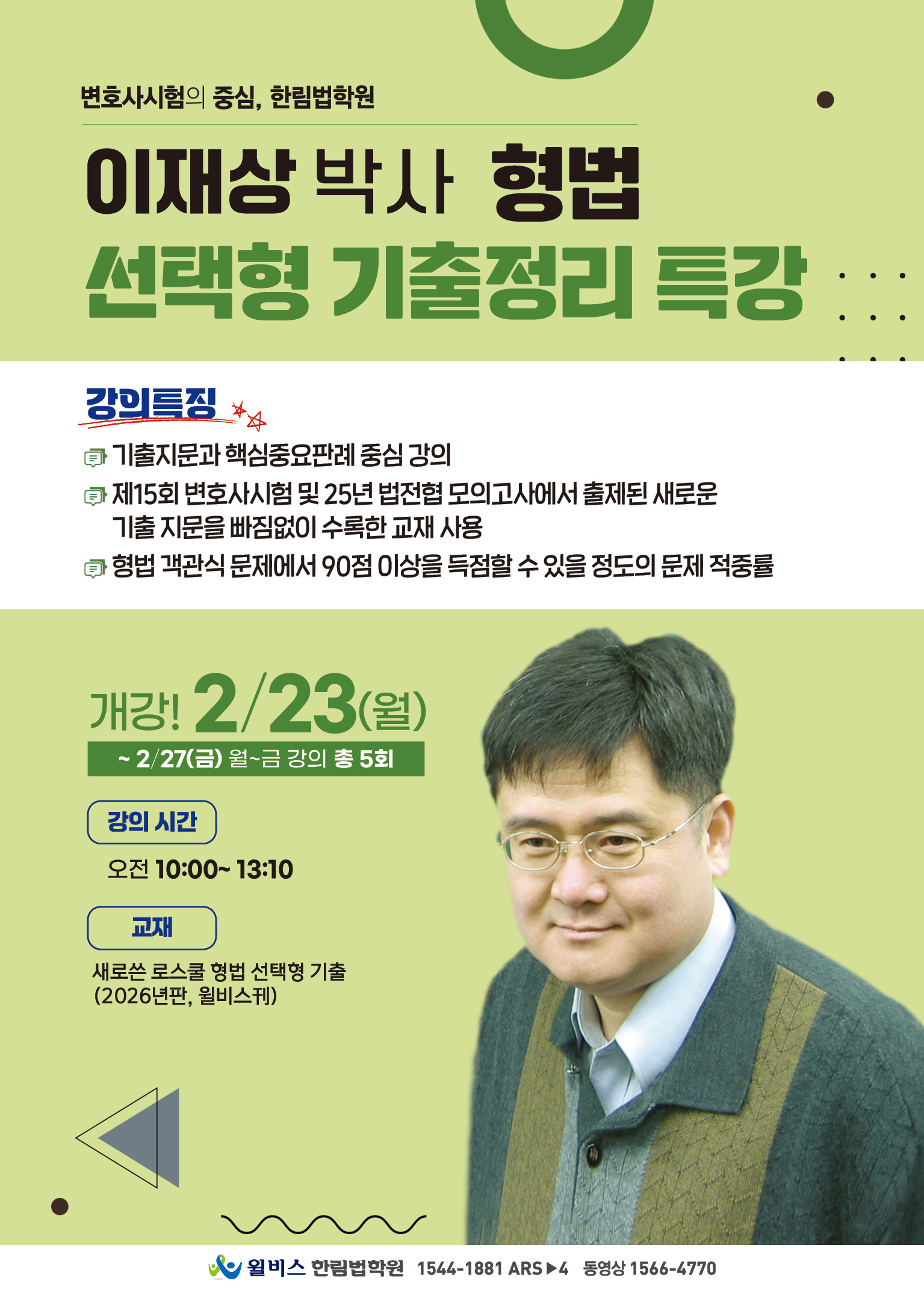 [특강] 이재상 박사 형법 선택형 기출정리 특강(2/23, 월) 작성자한림법학원|작성시간26.02.09|조회수29 목록 댓글 0 글자크기 작게가 글자크기 크게가 다음검색 현재 게시글 추가 기능 열기 북마크 공유하기 신고 센터로 신고 댓글 댓글 0 댓글쓰기 답글쓰기 댓글 리스트