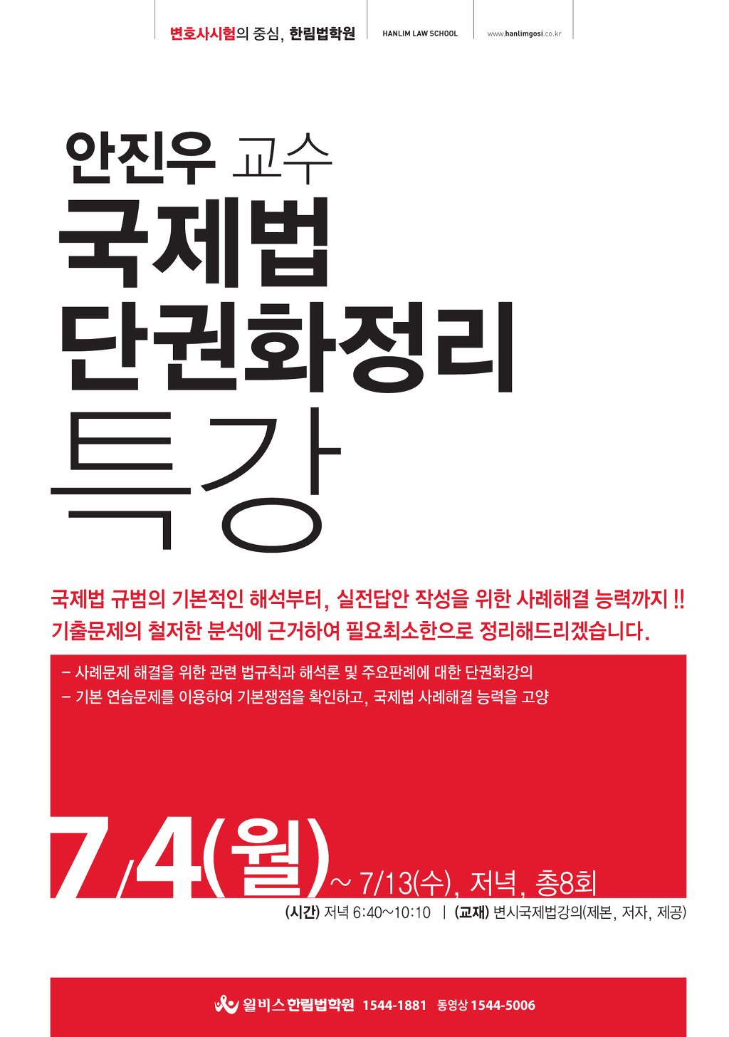 [특강] 안진우 교수 국제법 단권화특강 (7/4,월) 작성자한림법학원|작성시간16.06.22|조회수290 목록 댓글 0 글자크기 작게가 글자크기 크게가 다음검색 현재 게시글 추가 기능 열기 북마크 공유하기 신고 센터로 신고 댓글 댓글 0 댓글쓰기 답글쓰기 댓글 리스트