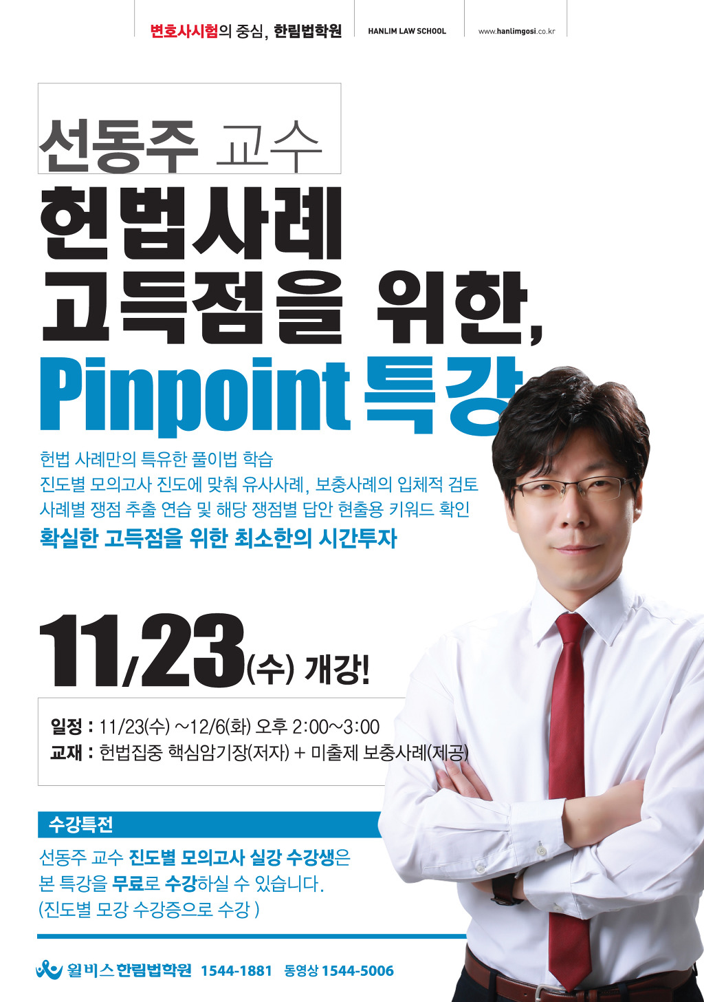 [특강] 선동주 교수 헌법사례 고득점을 위한 Pinpoint특강(11/23,수) 작성자한림법학원|작성시간16.11.11|조회수233 목록 댓글 0 글자크기 작게가 글자크기 크게가 다음검색 현재 게시글 추가 기능 열기 북마크 공유하기 신고 센터로 신고 댓글 댓글 0 댓글쓰기 답글쓰기 댓글 리스트