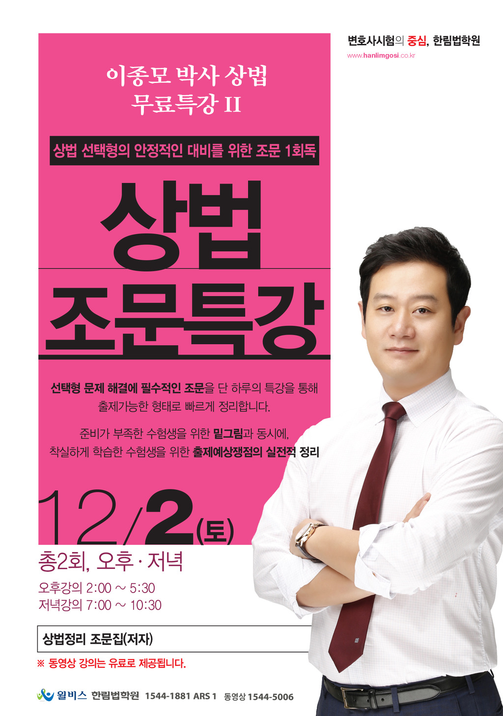 [무료특강] 이종모 박사 상법 조문특강(12/2,토) 개강 작성자한림법학원|작성시간17.11.07|조회수330 목록 댓글 0 글자크기 작게가 글자크기 크게가 다음검색 현재 게시글 추가 기능 열기 북마크 공유하기 신고 센터로 신고 댓글 댓글 0 댓글쓰기 답글쓰기 댓글 리스트