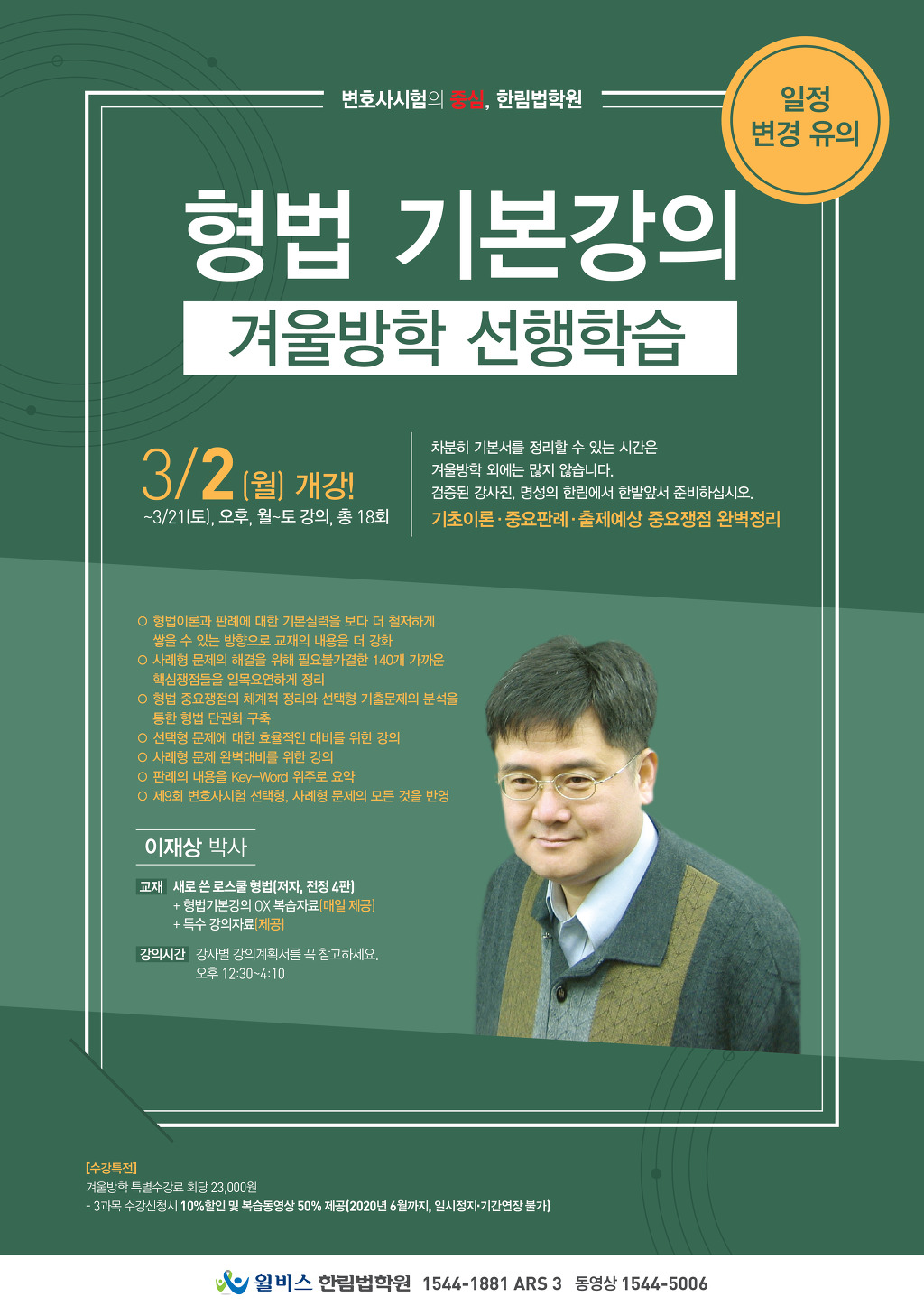 [기본강의] 이재상 박사 형법 겨울방학 기본강의(3/2,월) 작성자한림법학원|작성시간20.02.07|조회수206 목록 댓글 0 글자크기 작게가 글자크기 크게가 다음검색 현재 게시글 추가 기능 열기 북마크 공유하기 신고 센터로 신고 댓글 댓글 0 댓글쓰기 답글쓰기 댓글 리스트