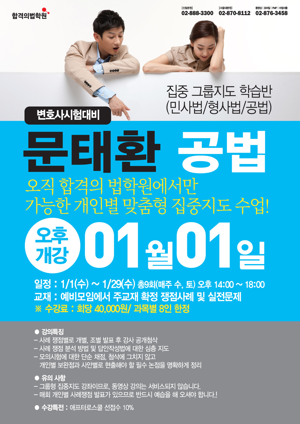 [집중 그룹지도 학습반] 공법(문태환 선생님) 1/1(수) 오후 개강 작성자합격의법학원|작성시간13.12.23|조회수121 목록 댓글 0 글자크기 작게가 글자크기 크게가 다음검색 현재 게시글 추가 기능 열기 북마크 공유하기 신고 센터로 신고 댓글 댓글 0 댓글쓰기 답글쓰기 댓글 리스트