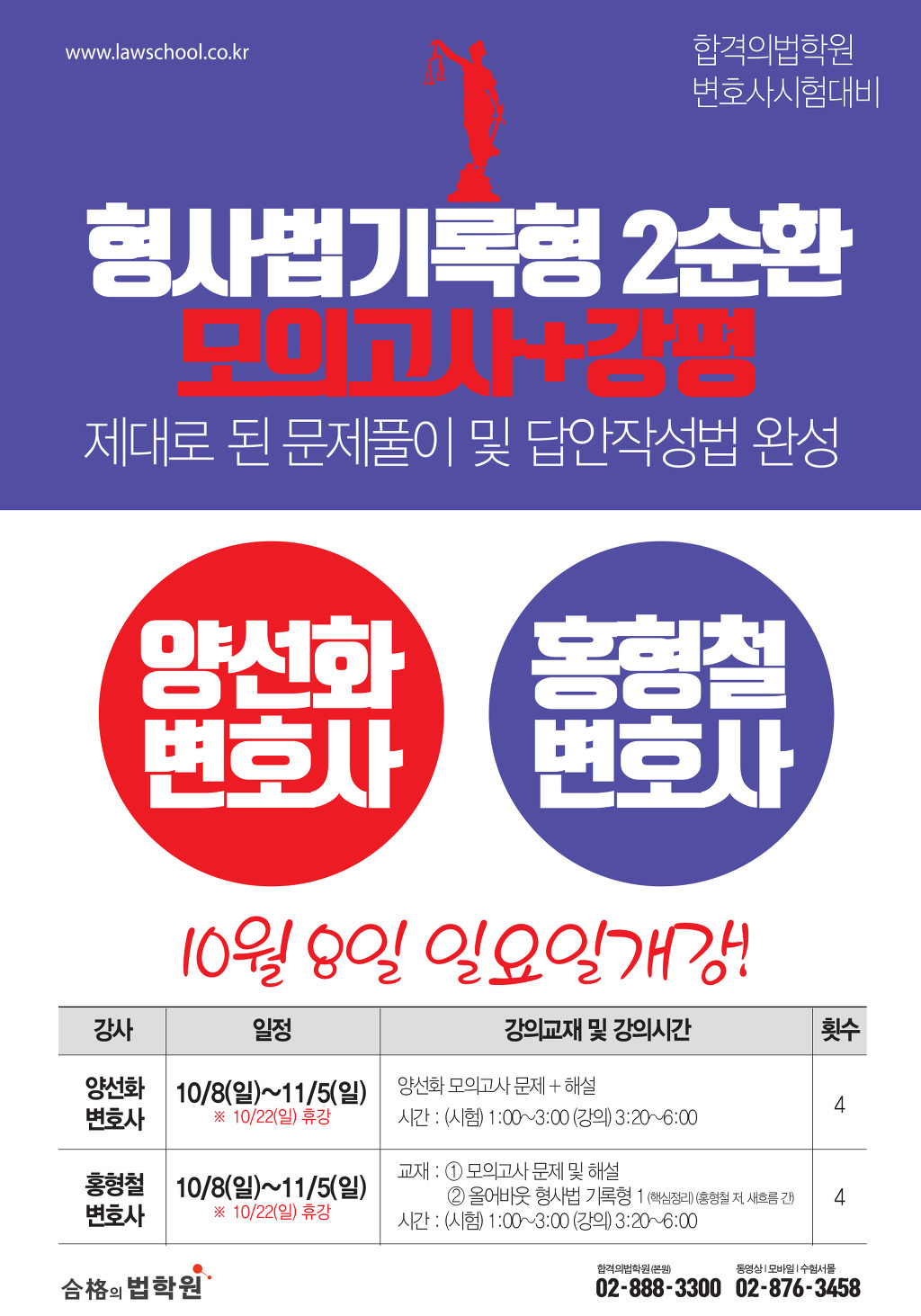 양선화,홍형철변호사의 형사법기록형 2순환(모의고사+강평) 강의안내(10/8,일 개강) 작성자합격의법학원|작성시간17.09.26|조회수153 목록 댓글 0 글자크기 작게가 글자크기 크게가 다음검색 현재 게시글 추가 기능 열기 북마크 공유하기 신고 센터로 신고 댓글 댓글 0 댓글쓰기 답글쓰기 댓글 리스트