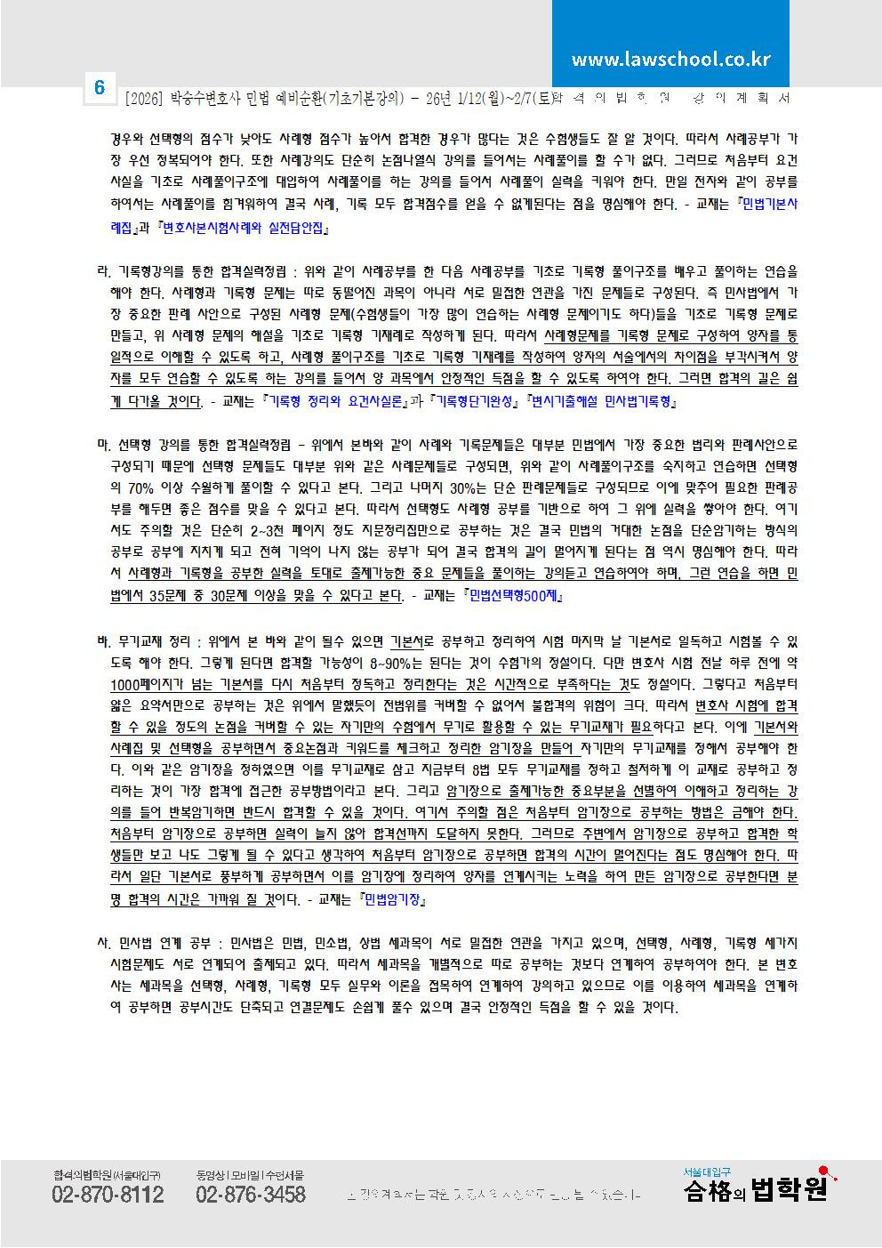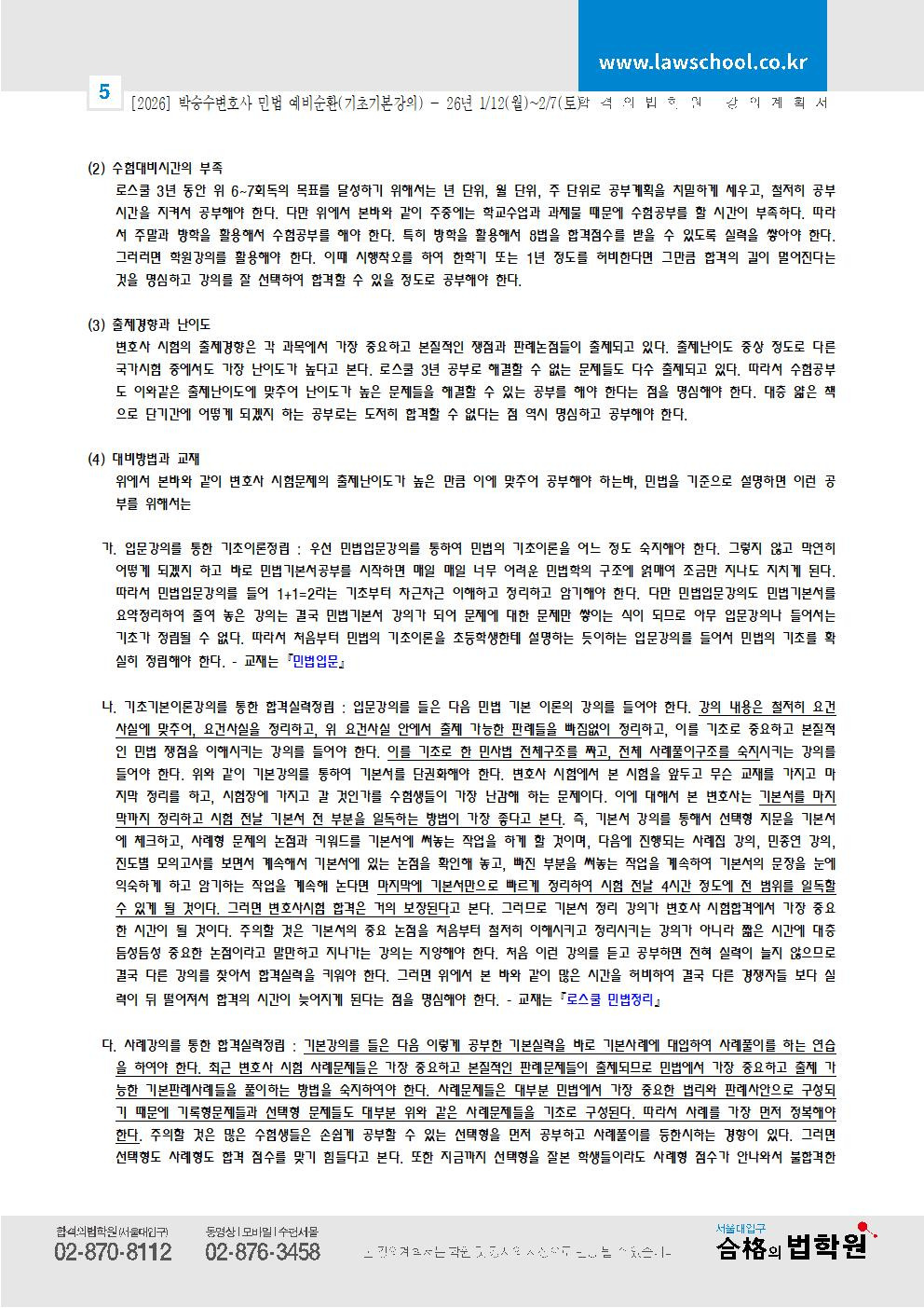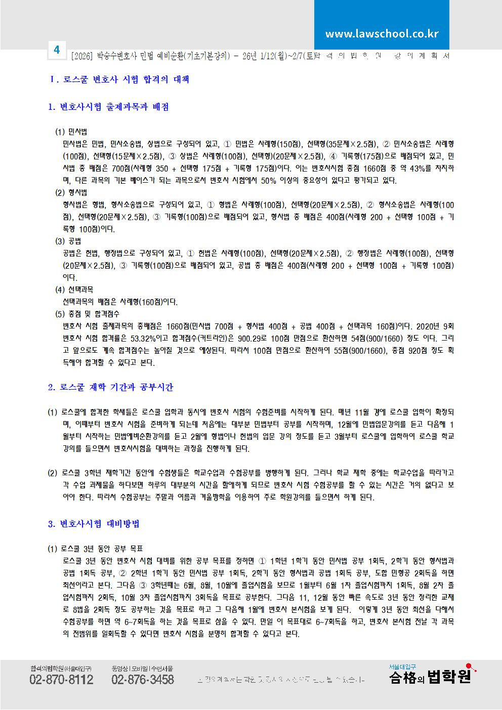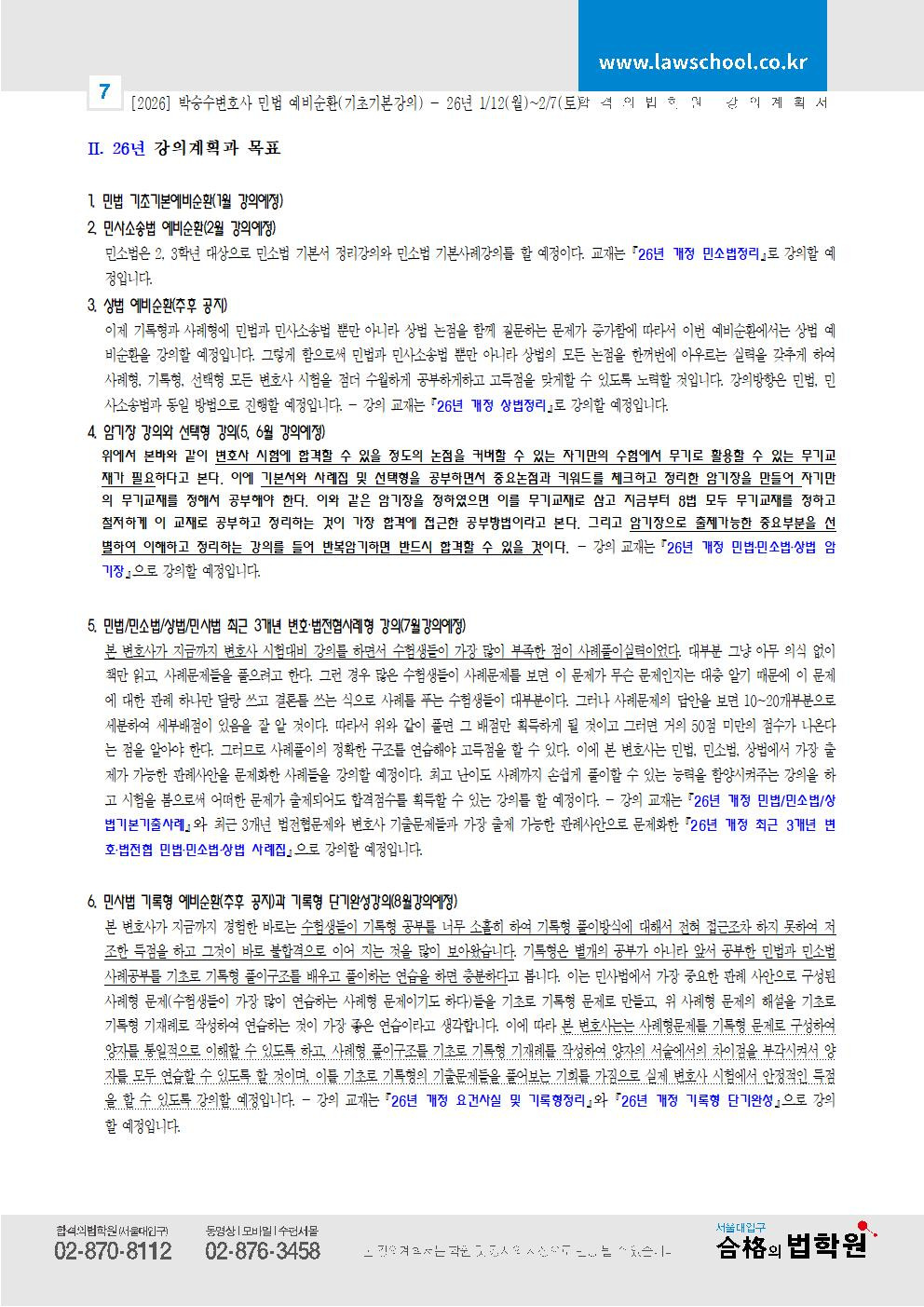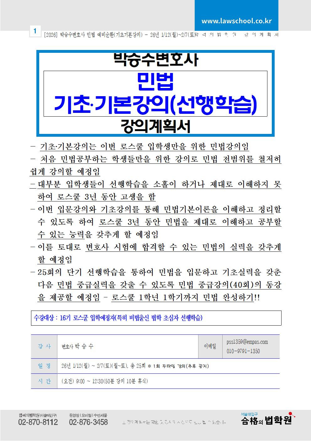 [합격의법학원] 변호사시험 박승수 민법 기본강의 강의계획서 (1/12,월 개강) 작성자합격의법학원|작성시간26.01.02|조회수38 목록 댓글 0 글자크기 작게가 글자크기 크게가 26년박승수변호사민법기초기본강의계획서(예비순환).pdf436.40KB 첨부파일첨부된 파일이 8개 있습니다. jpg 파일 26년박승수변호사민법기초기본강의계획서(예비순환)001.jpg 다운로드 jpg 파일 26년박승수변호사민법기초기본강의계획서(예비순환)002.jpg 다운로드 jpg 파일 26년박승수변호사민법기초기본강의계획서(예비순환)003.jpg 다운로드 jpg 파일 26년박승수변호사민법기초기본강의계획서(예비순환)004.jpg 다운로드 jpg 파일 26년박승수변호사민법기초기본강의계획서(예비순환)005.jpg 다운로드 jpg 파일 26년박승수변호사민법기초기본강의계획서(예비순환)006.jpg 다운로드 jpg 파일 26년박승수변호사민법기초기본강의계획서(예비순환)007.jpg 다운로드 pdf 파일 26년박승수변호사민법기초기본강의계획서(예비순환).pdf 다운로드 다음검색 현재 게시글 추가 기능 열기 북마크 공유하기 신고 센터로 신고 댓글 댓글 0 댓글쓰기 답글쓰기 댓글 리스트