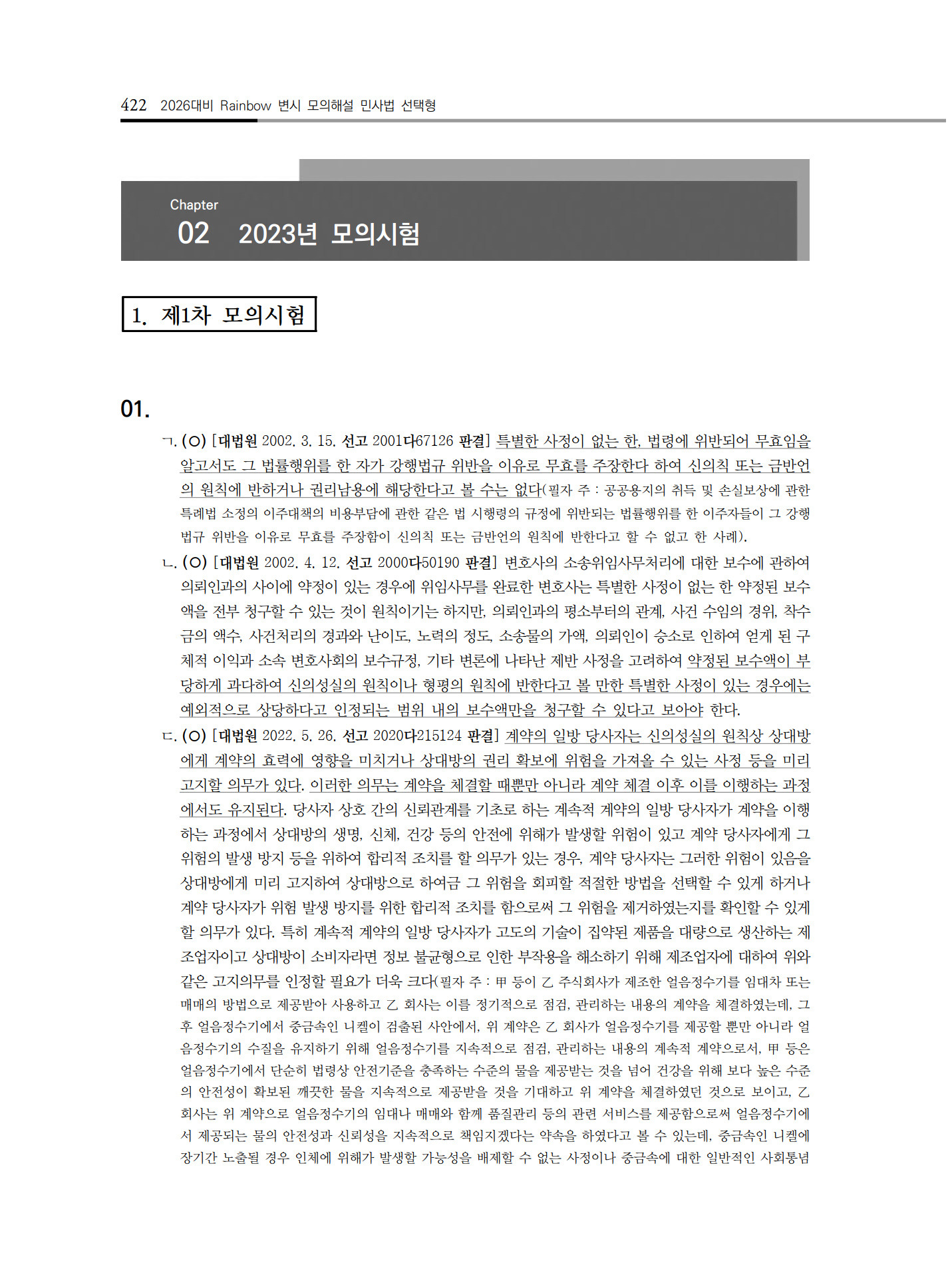 [스크랩] [신간 안내]2026대비 Rainbow 변시 모의해설 민사법 선택형 (연도별ㆍ회차별) 작성자도서출판 학연|작성시간25.02.11|조회수66 목록 댓글 0 글자크기 작게가 글자크기 크게가 1. 모의해설 민사법 선택형_일부.pdf653.25KB2. 모의해설 민사법 선택형_제원+머리말 등.hwp173.50KB 첨부파일첨부된 파일이 10개 있습니다. jpg 파일 모의해설 민사법 선택형_앞면표지.jpg 다운로드 jpg 파일 1. 모의해설 민사법 선택형_일부_01.jpg 다운로드 jpg 파일 1. 모의해설 민사법 선택형_일부_05.jpg 다운로드 jpg 파일 1. 모의해설 민사법 선택형_일부_03.jpg 다운로드 jpg 파일 1. 모의해설 민사법 선택형_일부_07.jpg 다운로드 jpg 파일 1. 모의해설 민사법 선택형_일부_04.jpg 다운로드 jpg 파일 1. 모의해설 민사법 선택형_일부_02.jpg 다운로드 jpg 파일 1. 모의해설 민사법 선택형_일부_06.jpg 다운로드 hwp 파일 2. 모의해설 민사법 선택형_제원+머리말 등.hwp 다운로드 pdf 파일 1. 모의해설 민사법 선택형_일부.pdf 다운로드 다음검색 스크랩 원문 : 학연출판사 현재 게시글 추가 기능 열기 북마크 공유하기 신고 센터로 신고 댓글 댓글 0 댓글쓰기 답글쓰기 댓글 리스트