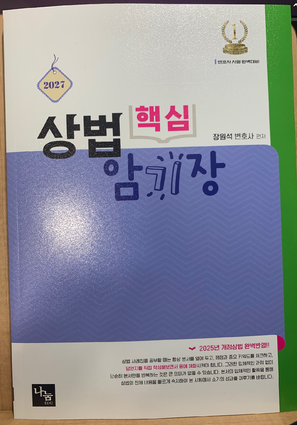 - 상법 암기장은 작년판에 비해 단 6쪽만이 증가한 211쪽이다. 2025년 개정 상법을 반영하였음에도, 기존 암기장이 가지고 있었던 최대의 강점인 ‘얇음’을 유지했다는 점에서 만족스럽다.