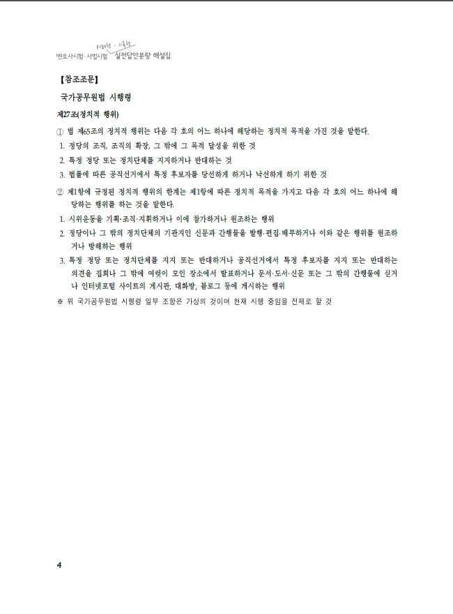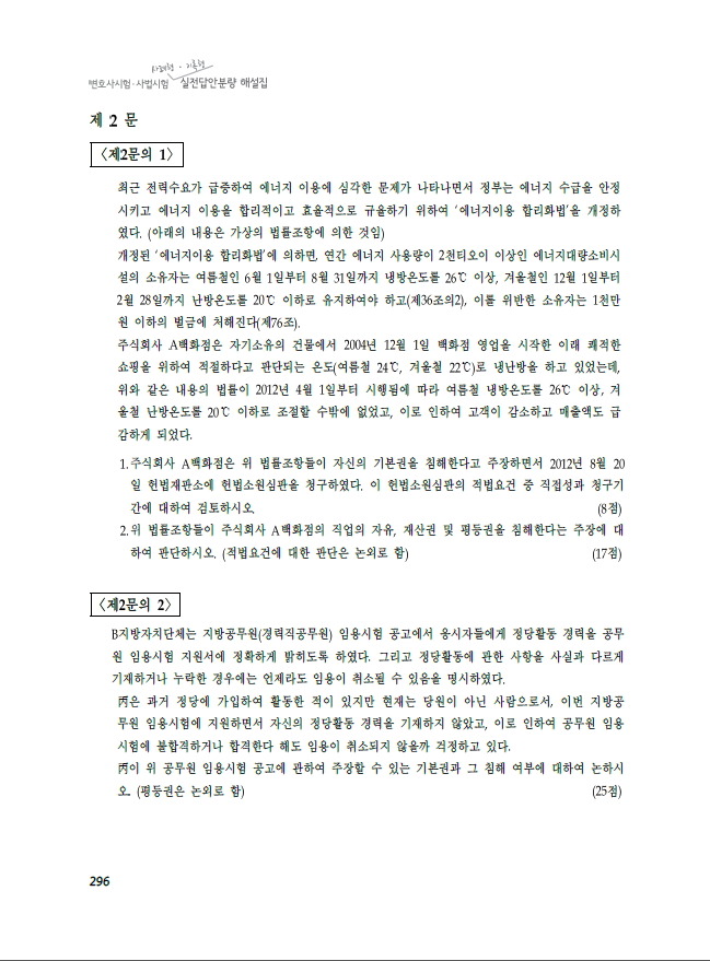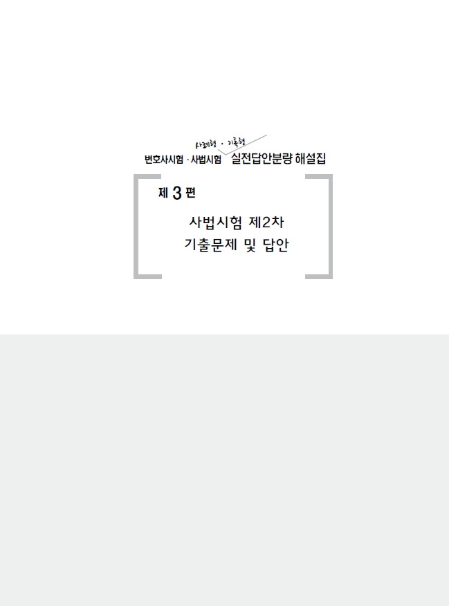 본 실전답안분량 해설집 시리즈의 답안을 보시고 분명 ‘이것도 어떻게 2시간 안에 쓰나’라고 생각하는 수험생도 있을 것입니다. 이 시리즈의 답안은 오류를 줄이기 위해 여러 개의 모범 답안을 비교하면서, 시간을 두고 작성한 것이기 때문에, 실제 시험장에서 수험생들이 이 정도의 답안을 작성하는 것은 거의 불가능에 가깝습니다. 단언컨대 합격을 위해 이 정도의 답안이 필요한 것은 절대 아닙니다. ‘모범 답안의 60%만 써도 수석이다’라는 말을 기억하시기 바랍니다. 이 시리즈의 답안은 실제 시험장에서 수험생이 쓸 수 있는 ‘최대’이기 때문에, 이 시리즈의 답안에 조금 못 미치는 답안을 작성해도 충분히 좋은 점수로 합격할 수 있습니다.
