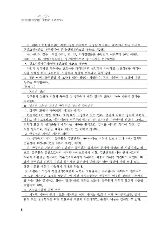 변호사 업무를 하면서 수험 답안을 쓰는 일은 재밌으면서도 동시에 무척 고된 일이었습니다. 그런데도 제 부탁에 같이 고생을 해준 공저자 오○○ 사무관, 이동식 변호사와 변호사시험이 얼마 남지 않았는데도 자료 수집과 헌법 답안 초안 작성에 도움을 준 연세대학교 법학전문대학원 정욱진에게 진심으로 감사하다는 말씀을 드립니다. 그리고 ‘기출판례정리’ 시리즈 출판에 이어 본 실전답안분량 해설집 시리즈 출판을 흔쾌히 결정해 주신 필통북스 정선균 사장님과 박종현 실장님, 그리고 교정과 편집에 애를 써주신 배은정 과장님께도 감사하다는 말씀을 드립니다. 마지막으로, 예쁜 아내와 눈물이 날 정도로 감동을 주는 딸아이에게 항상 사랑하겠다고 다짐을 합니다.