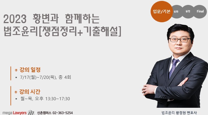 1) 변호사법, 변호사윤리장전을 중심으로 법조윤리 출제 범위 내 법령에 대한 조문 해설 강의를 진행함.
