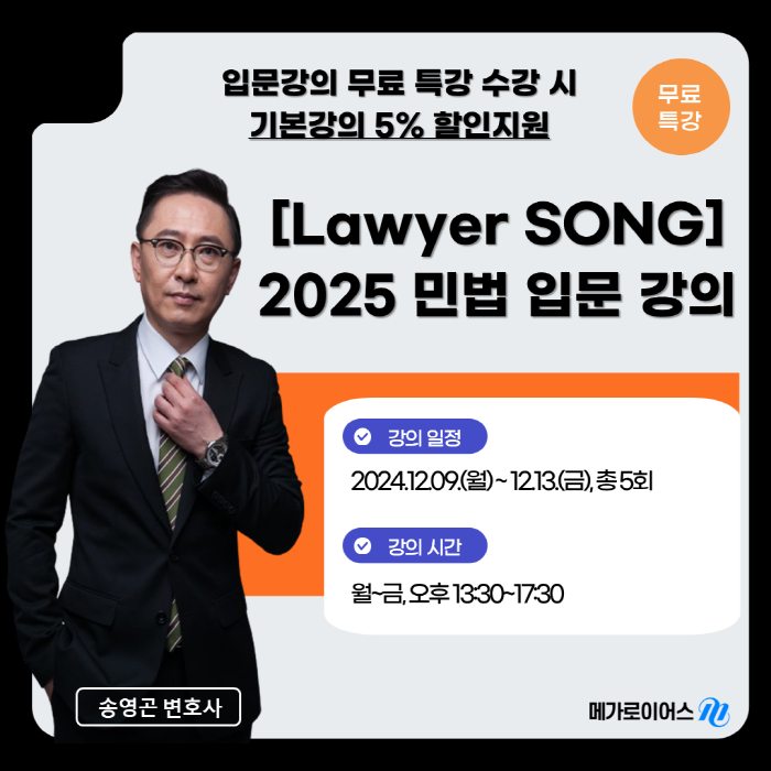 - 겨울방학 중 진행되는 본격적인 민법강좌로서, 민법입문 수강 후 연이어 수강하면 됩니다. ☞ 2024.12.16.(월)~2025.2.3.(월) 총 40회(13:00~17:30 / 월~토)