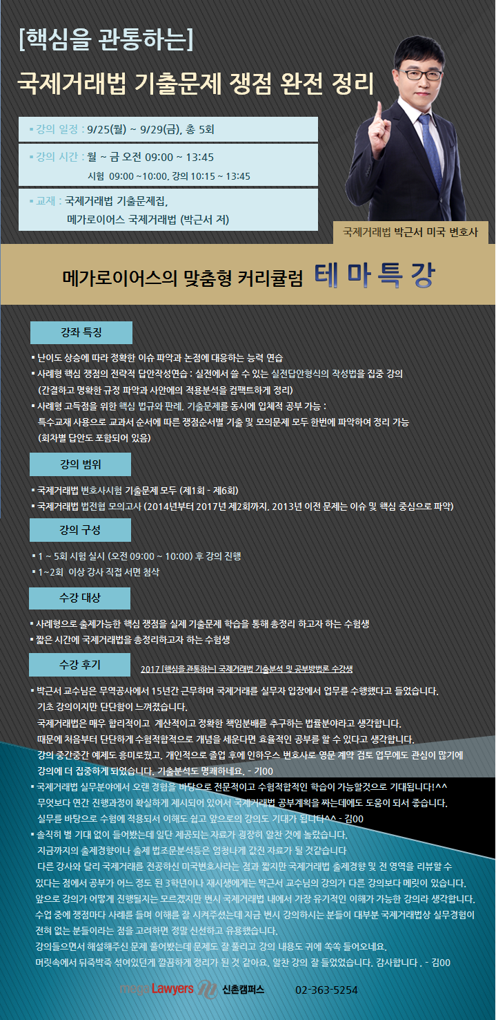 [변경 공지] 박근서 미국 변호사 [핵심을 관통하는] 국제거래법 기출문제 쟁점 완전 정리 (9/25 ~) 개강 작성자메가로이어스|작성시간17.09.22|조회수320 목록 댓글 0 글자크기 작게가 글자크기 크게가 다음검색 현재 게시글 추가 기능 열기 북마크 공유하기 신고 센터로 신고 댓글 댓글 0 댓글쓰기 답글쓰기 댓글 리스트