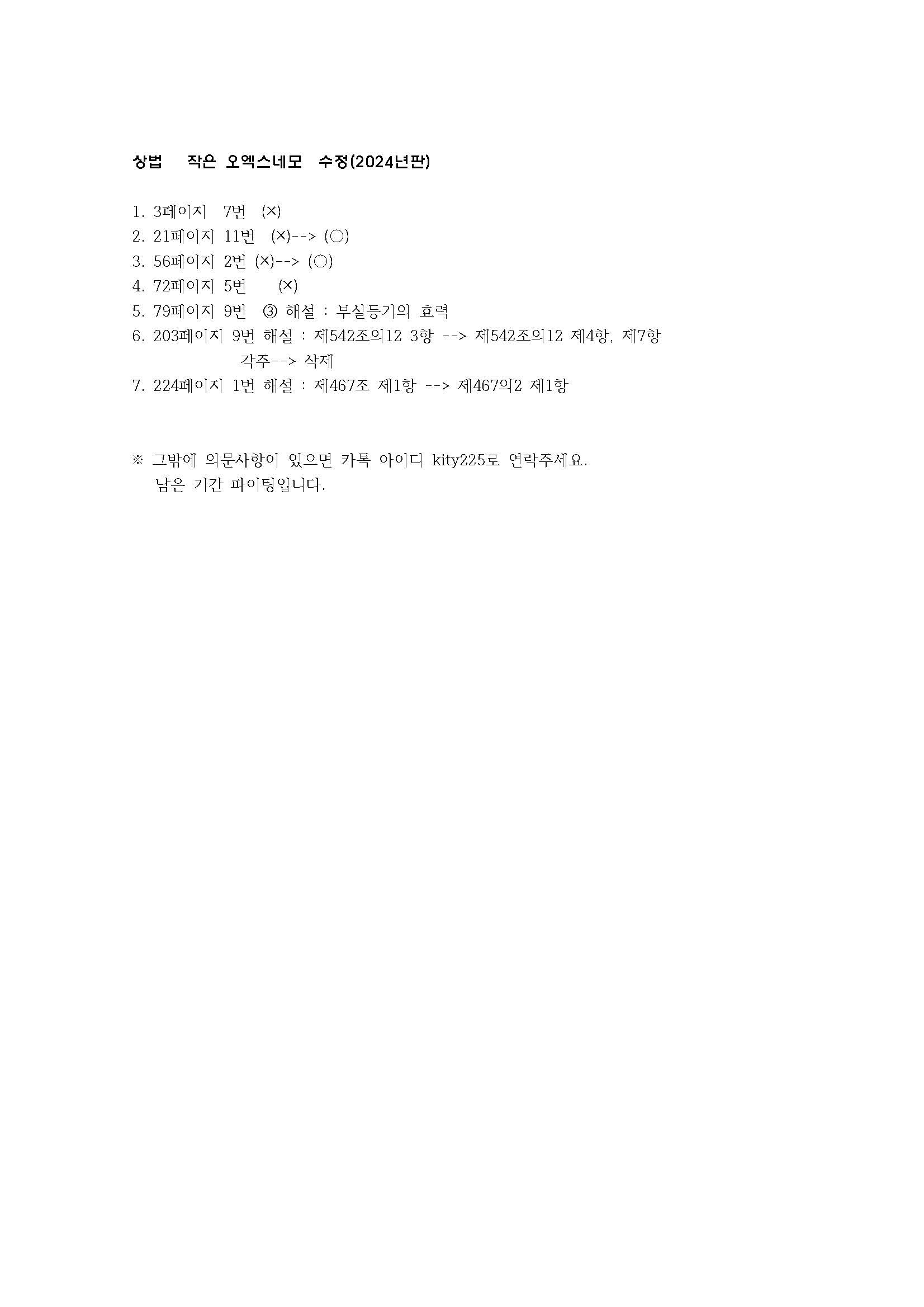 장원석 변호사님의 상법 작은 오엑스 네모(2024년판) 수정사항 입니다~ 작성자나눔에듀|작성시간24.12.09|조회수126 목록 댓글 1 글자크기 작게가 글자크기 크게가 상법 작은 오엑스네모 수정(2024년판).pdf23.42KB 첨부파일첨부된 파일이 2개 있습니다. jpg 파일 상법 작은 오엑스네모 수정(2024년판).jpg 다운로드 pdf 파일 상법 작은 오엑스네모 수정(2024년판).pdf 다운로드 다음검색 현재 게시글 추가 기능 열기 북마크 공유하기 신고 센터로 신고 댓글 댓글 1 댓글쓰기 답글쓰기 댓글 리스트 해당 댓글은 작성자와 운영진만 볼 수 있습니다. 댓글 전체보기