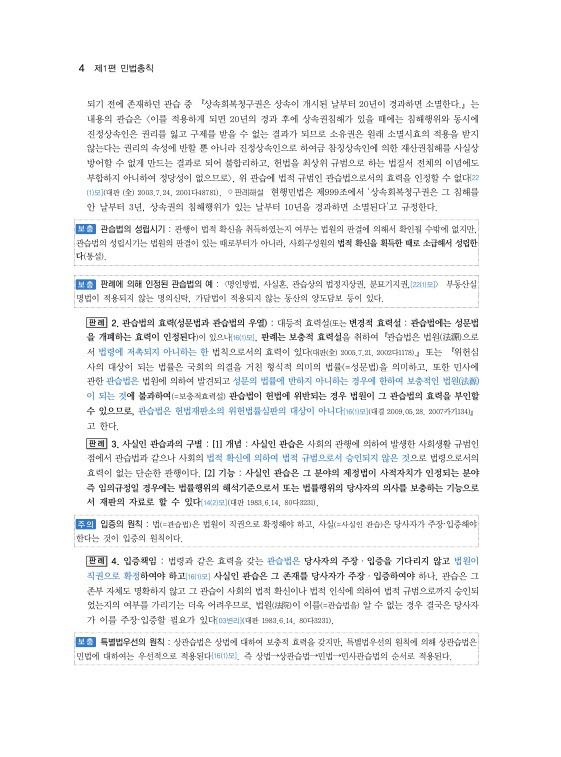 민법의 각 제도는 ‘조문’에 규정되어 있고 해당 조문의 입법취지에서 기본‘법리’가 나오고, 이 법리가 무수히 많은 사안에서 ‘판례’로 현출됩니다. ‘조문’과 ‘법리’에 대해 정확히 이해하면 ‘판례’가 그냥 보이는 경우가 많습니다. 따라서 최상의 민법 학습법은 먼저 조문, 그 다음 법리를 익혀 민법의 체계를 튼튼하게 세워 놓고 마지막으로 판례를 학습하는 것입니다.