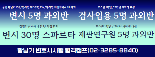 | 예약 및 문의사항 | 변호사시험 합격캠프 ☎ 02-3285-8840 최철승 원장 ☎ 010-5552-9431 카톡문의 : 황남기 공법 변호사합격캠프 (https://open.kakao.com/o/sBVethRe) | ||