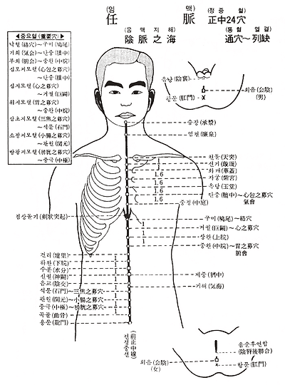 1. 회음(會陰) 2. 곡골(曲骨) 3. 중극(中極) 4. 관원(關元) 5. 석문(石門) 6. 기해(氣海) 7. 음교(陰交) 8. 신궐(神闕) 9. 수분(水分) 10. 하완(下脘) 11. 건리(建里) 12. 중완(中脘) 13. 상완(上脘) 14. 거궐(巨闕) 15. 구미(鳩尾) 16. 중정(中庭) 17. 단중(전중( 中)) 18. 옥당(玉堂) 19. 자궁(紫宮) 20. 화개(華蓋) 21. 선기(璇璣) 22. 천돌天突) 23. 염천(廉泉) 24. 승장(承漿)