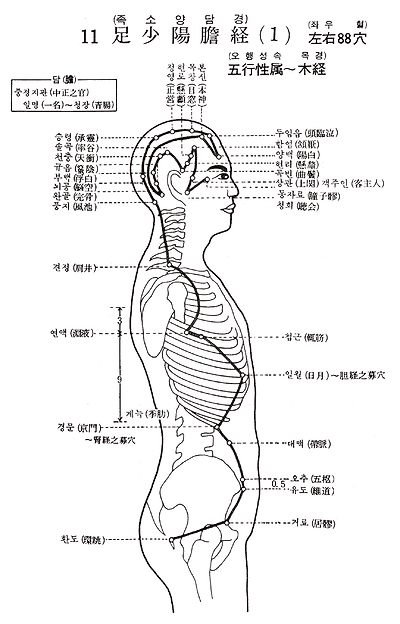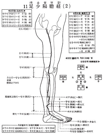 1. 동자료(瞳子 ) 2. 청회(聽會) 3. 상관(上關) 4. 함염( 厭) 5. 현로(懸 ) 6. 현리(懸厘) 7. 곡빈(曲 ) 8. 솔곡(率谷) 9. 천충(天衝) 10. 부백(浮白) 11. 두규음(頭竅陰) 12. 완골(完骨) 13. 본신(本神) 14. 양백(陽白) 15. 두임읍(頭臨泣) 16. 목창(目窓) 17. 정영(正營) 18. 승령(承靈) 19. 뇌공(腦空) 20. 풍지(風池) 21. 견정(肩井) 22. 연액(淵液) 23. 첩근(輒筋) 24. 일월(日月) 25. 경문(京門) 26. 대맥(帶脈) 27. 오추(五樞) 28. 유도(維道) 29. 거료(居 ) 30. 환도(環跳) 31. 풍시(風市) 32. 중독(中瀆) 33. 슬양관(膝陽關) 34. 양릉천(陽陵泉) 35. 양교(陽交) 36. 외구(外丘) 37. 광명(光明) 38. 양보(陽輔) 39. 현종(懸鐘) 40. 구허(丘墟) 41. 족임읍(足臨泣) 42. 지오회(地五會) 43. 협계(俠谿) 44. 족규음(足竅陰)