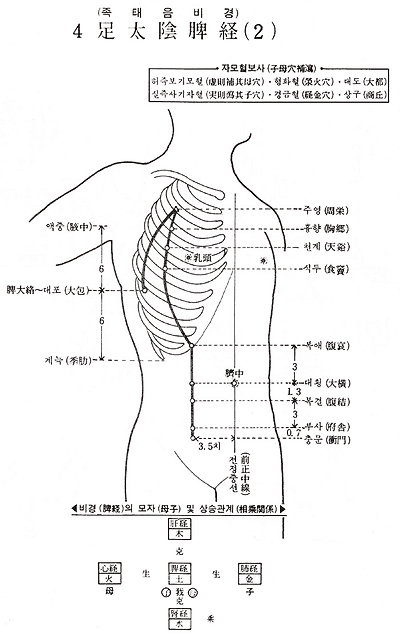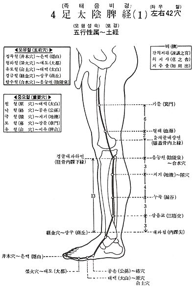 1. 은백(隱白) 2. 태도(太都) 3. 태백(太白) 4. 공손(公孫) 5. 상구(商丘) 6. 삼음교(三陰交) 7. 누곡(漏谷) 8. 지기(地機) 9. 음릉천(陰陵泉) 10. 혈해(血海) 11. 기문(箕門) 12. 충문(衝門) 13. 부사(府舍) 14. 복결(腹結) 15. 대횡(大橫) 16. 복애(腹哀) 17. 식두(食竇) 18. 천계(天谿) 19. 흉향(胸鄕) 20. 주영(周榮) 21. 대포(大包)
