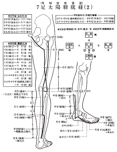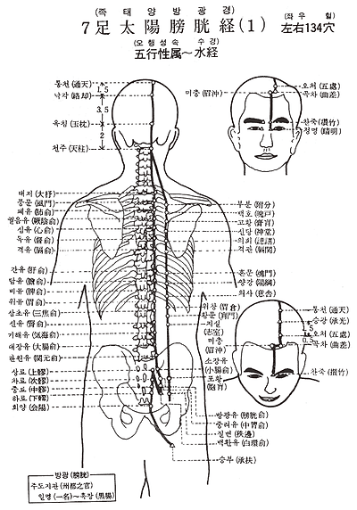 1. 정명(睛明) 2. 찬죽( 竹) 3. 미충(眉衝) 4. 곡차(曲差) 5. 오처(五處) 6. 승광(承光) 7. 통천(通天) 8. 낙각(絡却) 9. 옥침(玉枕) 10. 천주(天柱) 11. 대저(大 ) 12. 풍문(風門) 13. 폐유(肺兪) 14. 궐음유(厥陰兪) 15. 심유(心兪) 16. 독유(督兪) 17. 격유(膈兪) 18. 간유(肝兪) 19. 담유(膽兪) 20. 비유(脾兪) 21. 위유(胃兪) 22. 삼초유(三焦兪) 23. 신유(腎兪) 24. 기해유(氣海兪) 25. 대장유(大腸兪) 26. 관원유(關元兪) 27. 소장유(小腸兪) 28. 방광유(膀胱兪) 29. 중려유(中 兪) 30. 백환유(白環兪) 31. 상료(上 ) 32. 차료(次 ) 33. 중료(中 ) 34. 하료(下 ) 35. 회양(會陽) 36. 승부(承扶) 37. 은문(殷門) 38. 부극(浮隙) 39. 위양(委陽) 40. 위중(委中) 41. 부분(附分) 42. 백호(魄戶) 43. 고황(膏 ) 44. 신당(神堂) 45. 의희( ) 46. 격관(膈關) 47. 혼문(魂門) 48. 양강(陽綱) 49. 의사(意舍) 50. 위창(胃倉) 51. 황문( 門) 52. 지실(志室) 53. 포황(胞 ) 54. 질변(秩邊) 55. 합양(合陽) 56. 승근(承筋) 57. 승산(承山) 58. 비양(飛揚) 59. 부양( 陽) 60. 곤륜(崑崙) 61. 복삼(僕參) 62. 신맥(申脈) 63. 금문(金門) 64. 경골(京骨) 65. 속골(束骨) 66. 족통곡(足通谷) 67. 지음(至陰)