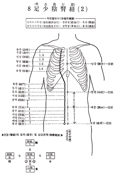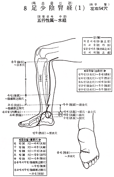 1. 용천(湧泉) 2. 연곡(然谷) 3. 태계(太谿) 4. 태종(太鐘) 5. 수천(水泉) 6. 조해(照海) 7. 복류(復溜) 8. 교신(交信) 9. 축빈(築賓) 10. 음곡(陰谷) 11. 횡골(橫骨) 12. 대혁(大赫) 13. 기혈(氣穴) 14. 사만(四滿) 15. 중주(中注) 16. 황유( 兪) 17. 상곡(商曲) 18. 석관(石關) 19. 음도(陰都) 20. 복통곡(腹通谷) 21. 유문(幽門) 22. 보랑(步廊) 23. 신봉(神封) 24. 영허(靈墟) 25. 신장(神藏) 26. 욱중(彧中) 27. 유부(兪府)