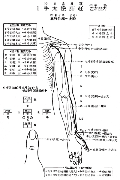 1. 중부(中府) 2. 운문(雲門) 3. 천부(天府) 4. 협백(俠白) 5. 척택(尺澤) 6. 공최(孔最) 7. 열결(列缺) 8. 경거(經渠) 9. 태연(太淵) 10. 어제(魚際) 11. 소상(少商)