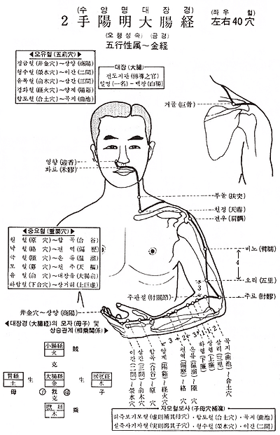 1. 상양(商陽) 2. 이간(二間) 3. 삼간(三間) 4. 합곡(合谷) 5. 양계(陽谿) 6. 편력(偏歷) 7. 온류(溫溜) 8. 하렴(下廉) 9. 상렴(上廉) 10. 수삼리(手三里) 11. 곡지(曲池) 12. 주료( ) 13. 수오리(手五里) 14. 비노(臂 ) 15. 견우(肩 ) 16. 거골(巨骨) 17. 천정(天鼎) 18. 부돌(扶突) 19. 화료(禾 ) 20. 영향(迎香)
