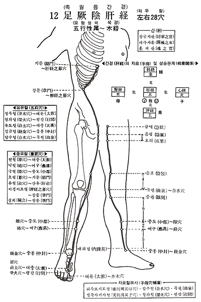 1. 태돈(太敦) 2. 행간(行間) 3. 태충(太衝) 4. 중봉(中封) 5. 여구( 溝) 6. 중도(中都) 7. 슬관(膝關) 8. 곡천(曲泉) 9. 음포(陰包) 10. 족오리(足五里) 11. 음렴(陰廉) 12. 급맥(急脈) 13. 장문(章門) 14. 기문(期門)