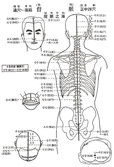 1. 장강(長强) 2. 요유(腰兪) 3. 요양관(腰陽關) 4. 명문(命門) 5. 현추(懸樞) 6. 척중(脊中) 7. 중추(中樞) 8. 근축(筋縮) 9. 지양(至陽) 10. 영대(靈臺) 11. 신도(神道) 12. 신주(身柱) 13. 도도(陶道) 14. 대추(大椎) 15. 아문(啞門) 16. 풍부(風府) 17. 뇌호(腦戶) 18. 강간(强間) 19. 후정(後頂) 20. 백회(百會) 21. 전정(前頂) 22. 신회( 會) 23. 상성(上星) 24. 신정(神庭) 25. 소료(素 ) 26. 수구(水溝) 27. 태단(兌端) 28. 은교( 交)