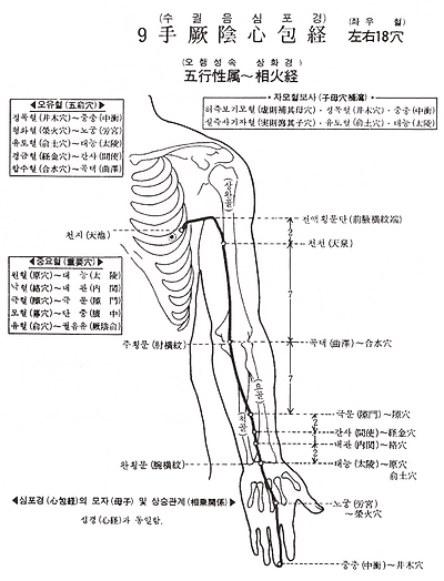 1. 천지(天池) 2. 천천(天泉) 3. 곡택(曲澤) 4. 극문(隙門) 5. 간사(間使) 6. 내관(內關) 7. 태릉(太陵) 8. 노궁(勞宮) 9. 중충(中衝)