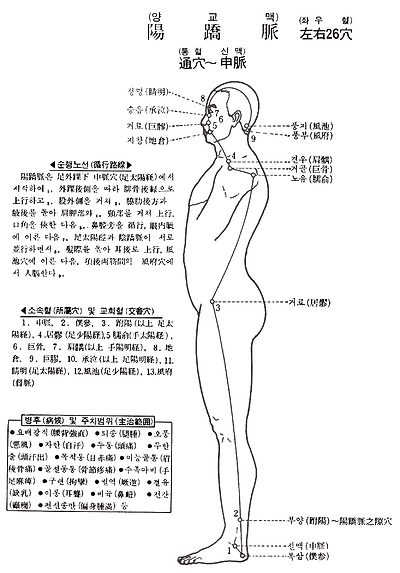 1. 신맥(申脈) 2. 복삼(僕參) 3. 부양( 陽) 4. 거료(居 ) 5. 노유( 兪) 6. 거골(巨骨) 7. 견우(肩 ) 8. 지창(地倉) 9. 거료(巨 ) 10. 승읍(承泣) 11. 정명(睛明) 12. 풍지(風池) 13. 풍부(風府)