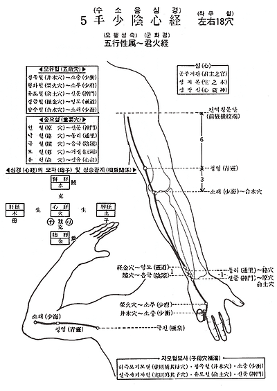 1. 극천(極泉) 2. 청영(靑靈) 3. 소해(少海) 4. 영도(靈道) 5. 통리(通里) 6. 음극(陰隙) 7. 신문(神門) 8. 소부(少府) 9. 소충(少衝)