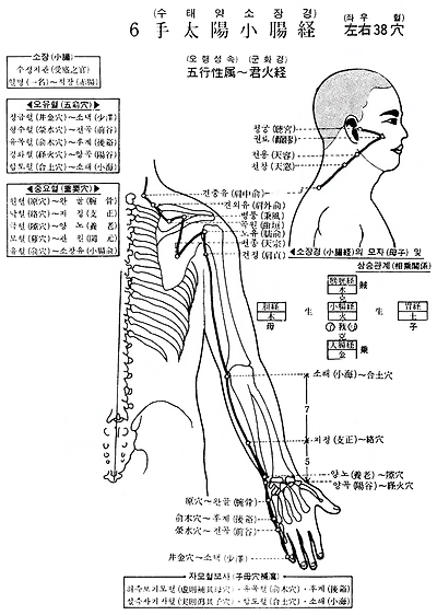 1. 소택(少澤) 2. 전곡(前谷) 3. 후계(後谿) 4. 완골(腕骨) 5. 양곡(陽谷) 6. 양로(養老) 7. 지정(支正) 8. 소해(小海) 9. 견정(肩貞) 10. 노유( 兪) 11. 천종(天宗) 12. 병풍(秉風) 13. 곡원(曲垣) 14. 견외유(肩外兪) 15. 견중유(肩中兪) 16. 천창(天窓) 17. 천용(天容) 18. 권료( ) 19. 청궁(聽宮)