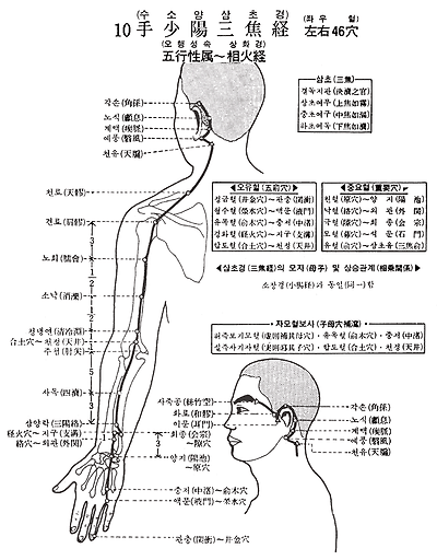 1. 관충(關衝) 2. 액문(液門) 3. 중저(中渚) 4. 양지(陽池) 5. 외관(外關) 6. 지구(支溝) 7. 회종(會宗) 8. 삼양락(三陽絡) 9. 사독(四瀆) 10. 천정(天井) 11. 청냉연(淸冷淵) 12. 소낙(消 ) 13. 노회( 會) 14. 견료(肩 ) 15. 천료(天 ) 16. 천유(天 ) 17. 예풍( 風) 18. 계맥( 脈) 19. 노식( 息) 20. 각손(角孫) 21. 이문(耳門) 22. 화료(和 ) 23. 사죽공(絲竹空)
