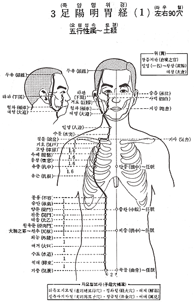 1. 승읍(承泣) 2. 사백(四白) 3. 거료(巨 ) 4. 지창(地倉) 5. 대영(大迎) 6. 협차(頰車) 7. 하관(下關) 8. 두유(頭維) 9. 인영(人迎) 10. 수돌(水突) 11. 기사(氣舍) 12. 결분(缺盆) 13. 기호(氣戶) 14. 고방(庫房) 15. 옥예(屋 ) 16. 응창(膺窓) 17. 유중(乳中) 18. 유근(乳根) 19. 불용(不容) 20. 승만(承滿) 21. 양문(梁門) 22. 관문(關門) 23. 태을(太乙) 24. 활육문(滑肉門) 25. 천추(天樞) 26. 외능(外陵) 27. 대거(大巨) 28. 수도(水道) 29. 귀래(歸來) 30. 기충(氣衝) 31. 비관( 關) 32. 복토(伏兎) 33. 음시(陰市) 34. 양구(梁丘) 35. 독비(犢鼻) 36. 족삼리(足三里) 37. 상거허(上巨虛) 38. 조구(條口) 39. 하거허(下巨虛) 40. 풍융(豊隆) 41. 해계(解谿) 42. 충양(衝