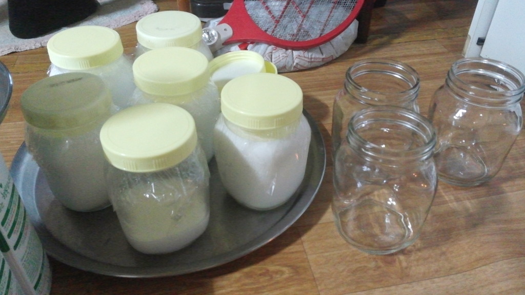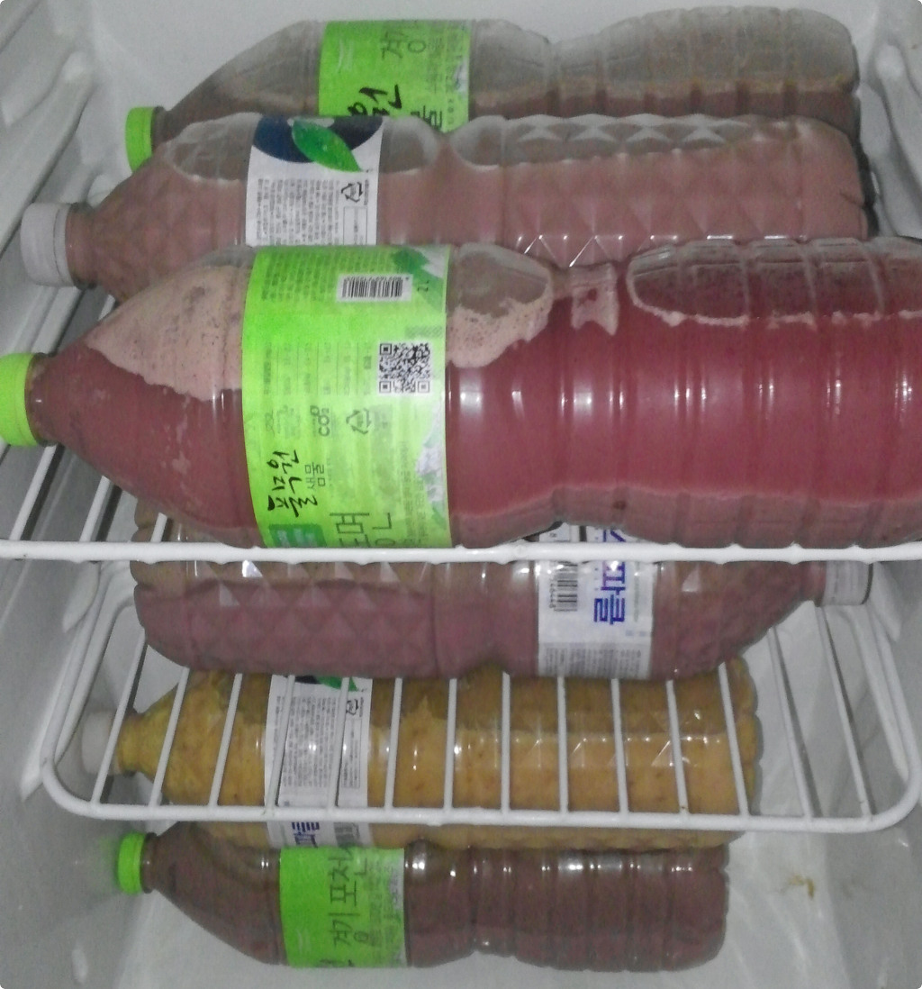 제가 전담해서 만드는데, 하루에 한번씩은 힘들기 때문이죠. 이틀에 한번 하기 위해 병 개수를 늘렸습니다. 쫀득해진 배양완료된 유산균은 바로 차가운 냉장고로 직행합니다. 여기서는 2~3일 있는거 전혀 문제없습니다. 일주일 정도까지도 괜찮습니다.