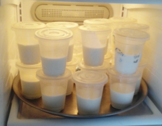 맨 앞에 보이는 병은 냉동실에서 약 6개월여 잠자고 있던 초벌 유산균입니다. 우유 약 200ml에 얼음 상태의 유산균 씨앗을 바로 넣었더랍니다. 그리고 따뜻한 냉장고 지붕으로 직행.