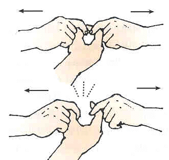 그리고 다른 사람이 그 고리를 만드는 엄지와 검지를 각각 다른 손으로 잡고, 있는 힘껏 떼어냅니다.