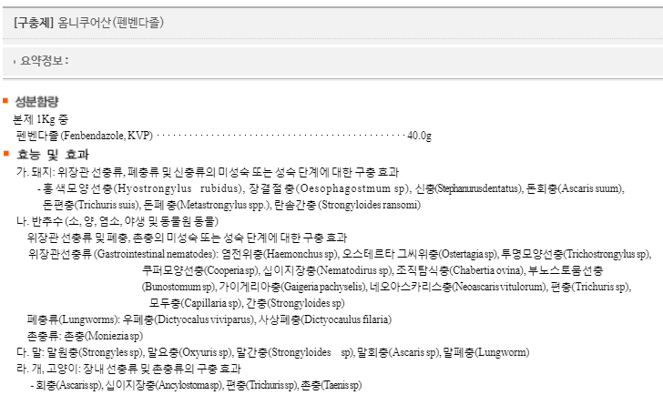 옴니쿠어는 소,돼지, 말, 개 등 큰 동물의 구충제입니다.