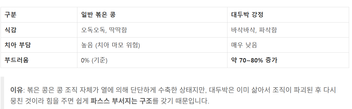 일반 볶은 콩의 단단함을 100이라고 가정했을 때, 대두박 강정의 단단함은 약 20~30% 수준으로 떨어집니다. 즉, 70~80% 정도 더 부드러워진다고 예상하시면 됩니다.