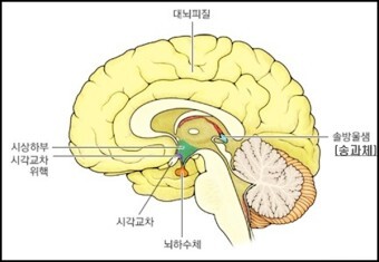 송과체(pineal gland)는 뇌의 한가운데 위치해 있는 팥알만 한 솔방울 모양의 내분비선으로 생체리듬을 조절하는 멜라토닌을 생성하는 곳으로 창조적이고 투시 인지 수면 안정 등의 탁월한 직관적 기능을 가진 제 3의 눈이다. 나아가 송과선에 칼슘 탄소 산소로 이루어진 방해석 결정체가 있어서 어떤 전자적인 역할이 보다 뛰어난 곳이라고 한다.