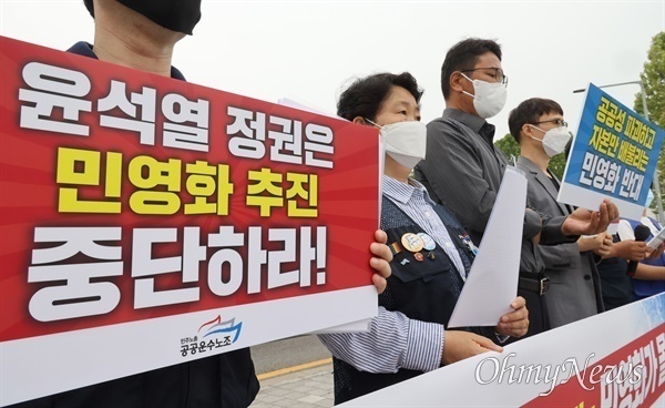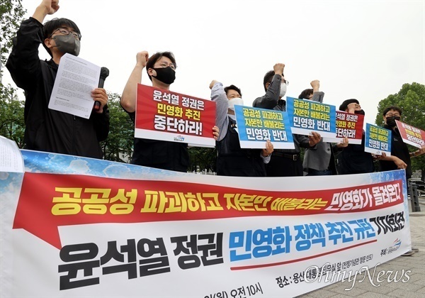 30일 서울 용산 대통령 집무실 앞에서 진행된 '윤석열 정권 민영화 정책 추진 규탄 회견'에서 현정희 공공운수노조 위원장이 윤석열 정부의 공공부문 민영화 추진 움직임을 비판하며 말했다. 현 위원장은 "대통령 비서실장이 국회에 나와서 한 답변에서도, 정부가 발표한 110대 국정과제 안에도 민영화 추진 의사가 곳곳에 각인돼 있다"면서 "이 정도면 가히 '민영화 정권'이라 불러도 손색이 없을 지경이다. 국민을 기만해서는 안 된다"라고 강조했다. 이에 야당을 중심으로 '민영화의 악몽이 되살아나고 있다'라고 비판하자 대통령실 관계자는 기자들에게 "김 실장 발언은 개인적 의견을 말한 것"이라면서 "새 정부 정책 방향을 말하는 게 아니다. 공기업 민영화는 검토한 적도 없고 계획한 적도 없다고 선명히 말씀드린다"라고 선을 그었다. "민영화 악몽 되살아나고 있다"