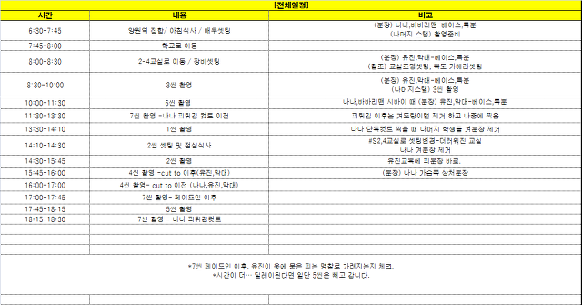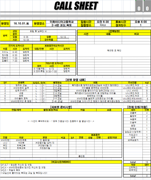 [연출제작부] 콜시트 최종 작성자박성원|작성시간16.09.30|조회수519 목록 댓글 0 글자크기 작게가 글자크기 크게가 일일촬영계획표_나나.xls 첨부파일첨부된 파일이 3개 있습니다. png 파일 나나_콜시트_최종.png 다운로드 png 파일 나나_콜시트_최종_1.png 다운로드 xls 파일 일일촬영계획표_나나.xls 다운로드 다음검색 현재 게시글 추가 기능 열기 북마크 공유하기 신고 센터로 신고 댓글 댓글 0 댓글쓰기 답글쓰기 댓글 리스트