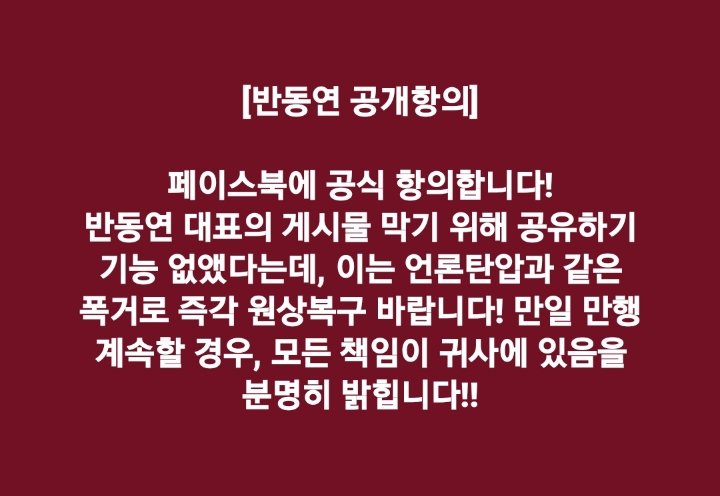 [반동연 공개항의] 페이스북에 공식 항의합니다! 반동연 대표의 게시물 막기 위해 공유하기 기능 없앴다는데, 이는 언론탄압과 같은 폭거로 즉각 원상복구 바랍