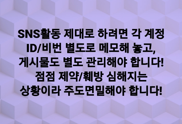 SNS활동 제대로 하려면 각 계정 ID/비번 별도로 메모해 놓고, 게시물도 별도 관리해야 합니다! 점점 제약/훼방 심해지는 상황이라 주도면밀해야 합니다!