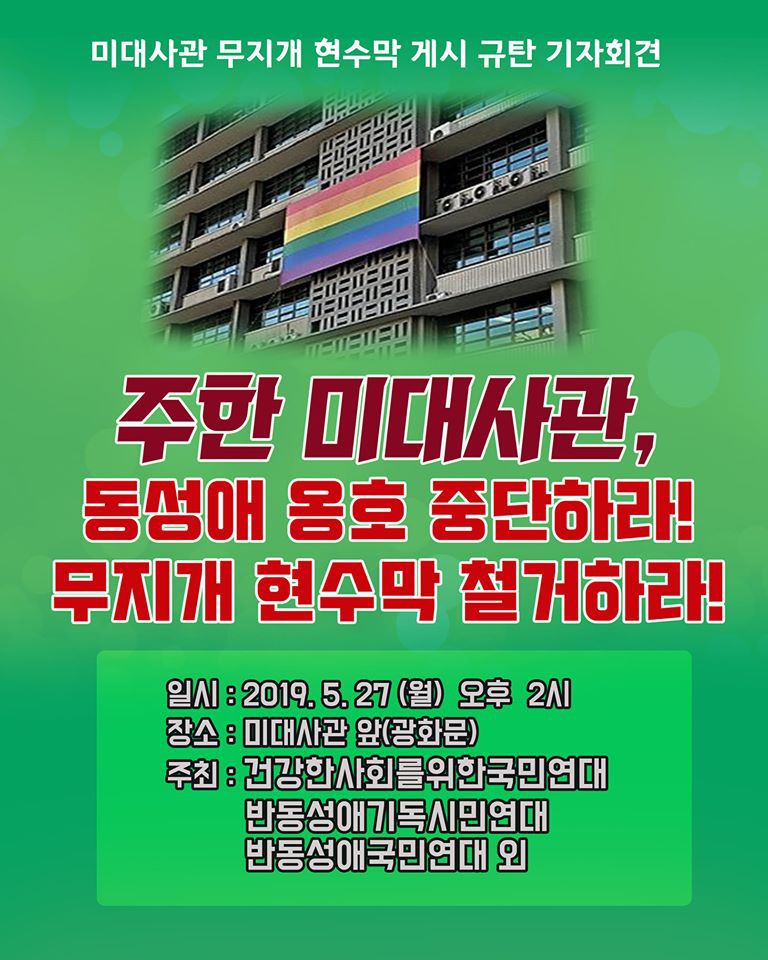 ❎미대사관 무지개 현수막 게시 규탄 기자회견❎ 주한미대사관, 📌동성애 옹호 중단하라! 📌무지개 현수막 철거하라! ●일시: 2019.5.27.월 오후2시 ●장