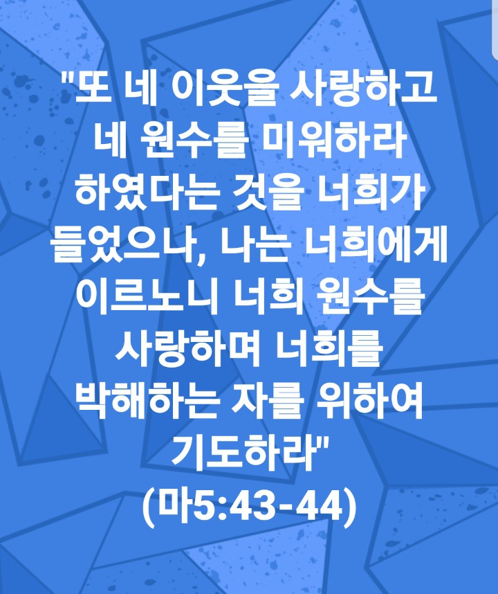 "또 네 이웃을 사랑하고 네 원수를 미워하라 하였다는 것을 너희가 들었으나, 나는 너희에게 이르노니 너희 원수를 사랑하며 너희를 박해하는 자를 위하여