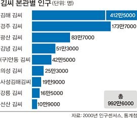 김씨의 본관별 인구 수를 보면 김해김씨가 412만5000명으로 가장 많고, 경주김씨가 173만7000명, 광산김씨가 83만7000명, 김녕김씨가 51만3000명, (구)안동김씨(경순왕의 넷째 아들 김은열의 둘째 김숙승을 시조로 하는 안동김씨로, 고려 개국공신인 김선평을 시조로 하는 신안동김씨와 구분된다)가 42만5000명이다. 그 외에도 의성김씨(25만3000명), 사성김해김씨(19만9000명), 강릉김씨(16만5000명), 선산김씨(10만9000명) 등이 있다(2000년 인구센서스, 통계청).